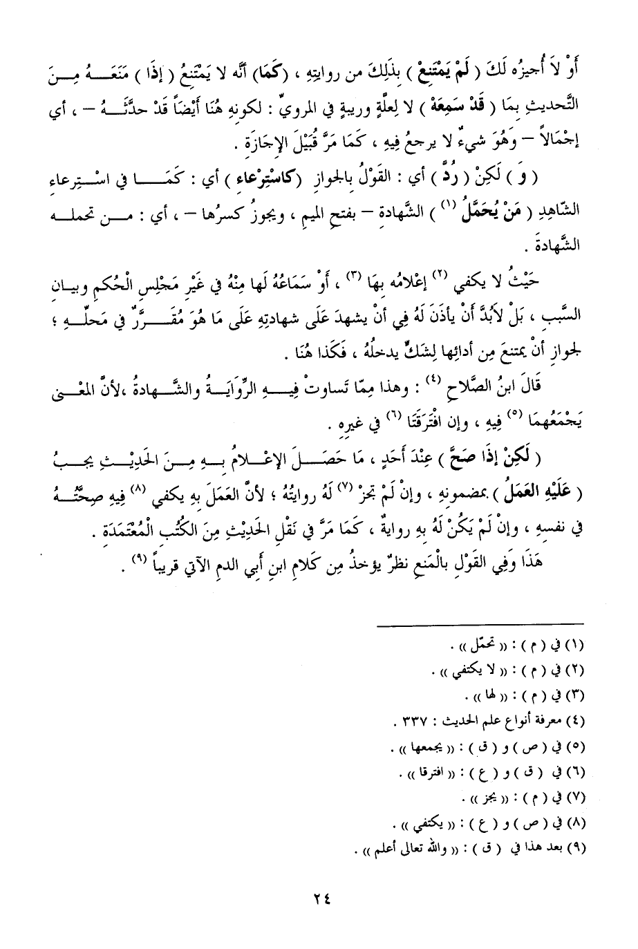 (لَكِنْ إذَا صَحَّ) عِنْدَ أَحَدٍ، مَا حَصَلَ الإعْلامُ بِهِ مِنَ الحَدِيْثِ يجبُ (عَلَيْهِ العَمَلُ) بمضمونِهِ، وإنْ لَمْ تجزْ (¬7) لَهُ روايتُهُ؛ لأنَّ العَمَلَ بِهِ يكفي (¬8) فِيهِ صِحَّتُهُ في نفسِهِ، وإنْ لَمْ يَكُنْ لَهُ بِهِ روايةٌ، كَمَا مَرَّ في نَقْلِ الحَدِيْثِ مِنَ الكُتُبِ الْمُعْتَمَدَةِ.