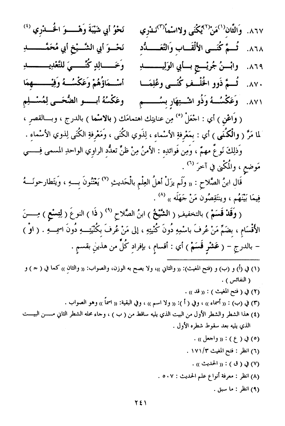 (وَقَدْ قَسَمْ) بالتخفيفِ (الشَّيْخُ) ابنُ الصَّلاحِ (¬9) (ذَا) النوعَ (لِتِسْعٍ) مِنَ الأَقْسَامِ، بِضَمِّ مَنْ عُرفَ باسْمِهِ دُونَ كُنْيتِهِ، إلى مَنْ عُرفَ بِكُنْيَتِهِ دُونَ اسمِهِ. (اوْ) - بالدرجِ - (عَشْرٍ قَسَمْ) أي: أقسامٍ، بإفرادِ كُلٍّ من هذينِ بقسمٍ.