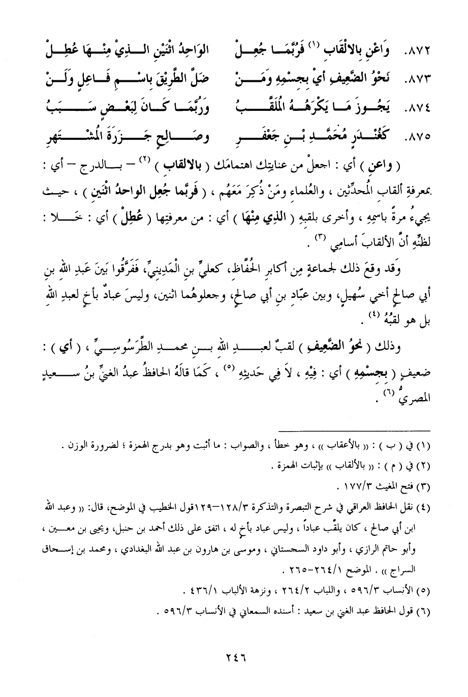 (واعنِ) أي: اجعلْ من عنايتِك اهتمامَك (بالالقابِ) (¬2) - بالدرج - أي: بمعرفةِ ألقابِ المُحدِّثين، والعُلماءِ ومَنْ ذُكِرَ مَعَهُم، (فَربَّما جُعِل الواحدُ اثْنَينِ)، حيث يجيءُ مرةً باسمِهِ، وأخرى بلقبِهِ (الذِي مِنْهَا) أي: من معرفتِها (عُطِلْ) أي: خَلا: لظنِّهِ أنَّ الألقابَ أسامِي (¬3).