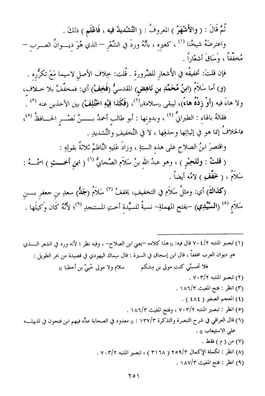 (و) أما سَلاَمُ (ابنُ مُحَمَّدِ بنِ نَاهِضٍ) المقدسيُّ (فَخِفْ) أي: فمخفَّفٌ بلا خلافٍ، ولا هاءَ فيه (أوْ زِدْهُ هاءً)، ليبقى ((سلامة)) (¬2)، (فَكَذا فِيْهِ اخْتُلِفْ) بين الآخذين عنه (¬3).