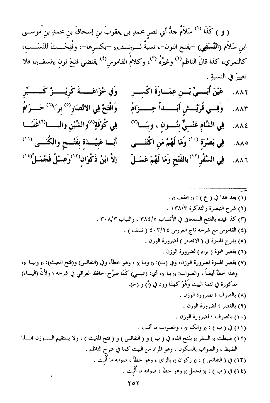 (و) كَذَا (¬1) سَلاَمٌ جدُّ أبي نصرٍ محمدِ بن يعقوبَ بنِ إسحاقَ بنِ محمدِ بنِ موسى ابنِ سَلاَم (النَّسَفِي) -بفتح النون-، نسبةً لـ ((نِسف)) -بكسرِها-، وفُتِحَتْ للنَسَبِ، كالنمري، كذا قالَ الناظم (¬2) وغيرُهُ (¬3)، وكلامُ القاموسِ (¬4) يقتضي فتحَ نونِ ((نسف))، فلا تغييرَ في النسبةِ.