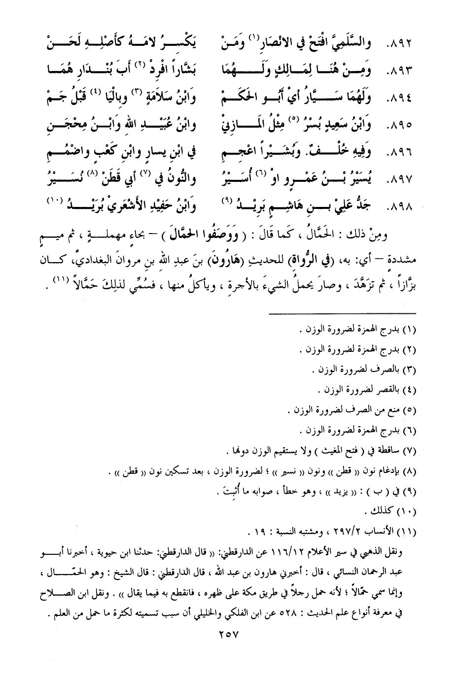 ومِنْ ذلك: الحَمَّالُ، كَما قَالَ: (وَوَصَفُوا الحمَّالَ) - بحاءٍ مهملةٍ، ثم ميمٍ مشددةٍ - أي: به، (في الرُّواةِ) للحديثِ (هَارُونَ) بنَ عبدِ اللهِ بنِ مروانَ البغداديَّ، كان بزَّازاً، ثم تزَهَّدَ، وصارَ يحملُ الشيءَ بالأجرةِ، ويأكلُ منها، فسُمِّي لذلِكَ حَمَّالاً (¬11).