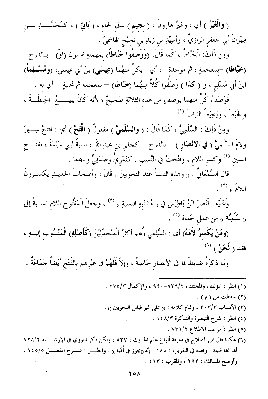 وَعَلَيْهِ اقْتَصرَ ابْنُ بَاطِيْش في ((مُشتَبِهِ النسبةِ)) (¬4)، وجعلَ الْمَفْتُوحَ اللامِ نسبةً إلى ((سَلَمِيَّة)) من عملِ حَماة (¬5).