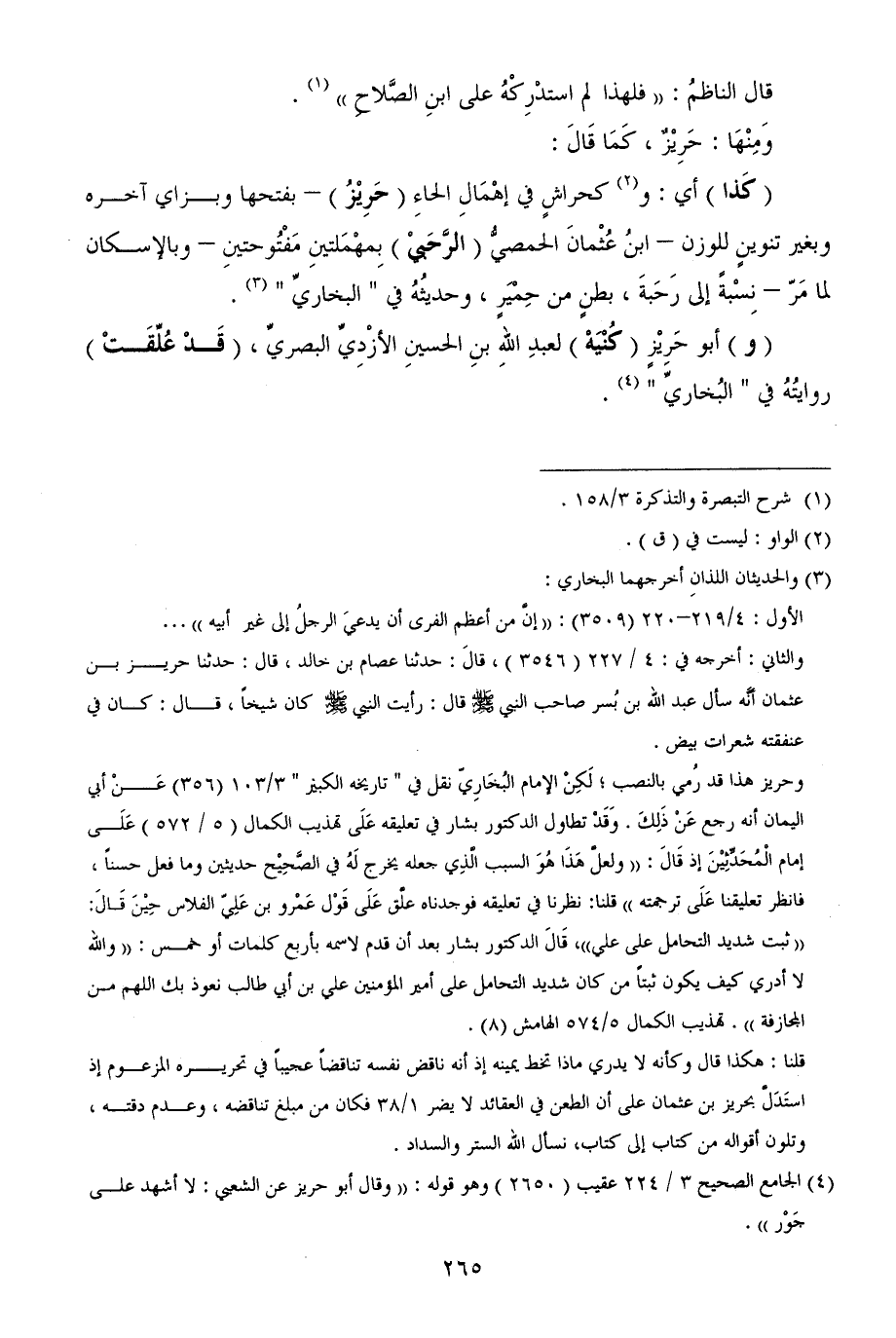 وحريز هذا قد رُمي بالنصب؛ لَكِنْ الإمام البُخَارِيّ نقل في " تاريخه الكبير " 3/ 103 (356) عَنْ أبي اليمان أنه رجع عَنْ ذَلِكَ. وَقَدْ تطاول الدكتور بشار في تعليقه عَلَى تهذيب الكمال (5/ 572) عَلَى إمام الْمُحَدِّثِيْنَ إذ قَالَ: ((ولعلَّ هَذَا هُوَ السبب الَّذِي جعله يخرج لَهُ في الصَّحِيْح حديثين وما فعل حسناً، فانظر تعليقنا عَلَى ترجمته)) قلنا: نظرنا في تعليقه فوجدناه علَّق عَلَى قَوْل عَمْرو بن عَلِيّ الفلاس حِيْنَ قَالَ: ((ثبت شديد التحامل على علي))، قَالَ الدكتور بشار بعد أن قدم لاسمه بأربع كلمات أو خمس: ((والله لا أدري كيف يكون ثبتاً من كان شديد التحامل على أمير المؤمنين علي بن أبي طالب نعوذ بك اللهم من المجازفة)). تهذيب الكمال 5/ 574 الهامش (8).