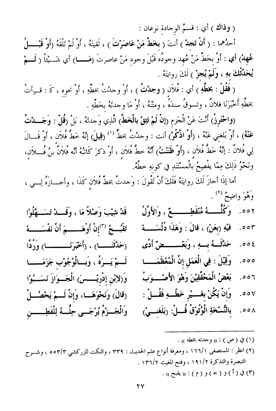 أحدُهما: (أَنْ تَجِدْ) أنتَ (بِخَطِّ مَنْ عَاصَرْتَ)، لَقيتَهُ، أَوْ لَمْ تَلْقَهُ (أَوْ قَبْلُ عُهِدْ) أي: أَوْ بِخَطِّ مَنْ عُهِد وجودُه قَبْلَ وجودِ مَنْ عاصرتَ (مَا) أي شَيْئاً (لَمْ يُحَدِّثْكَ بِهِ، وَلَمْ يُجِزْ) لَكَ روايتَهُ.