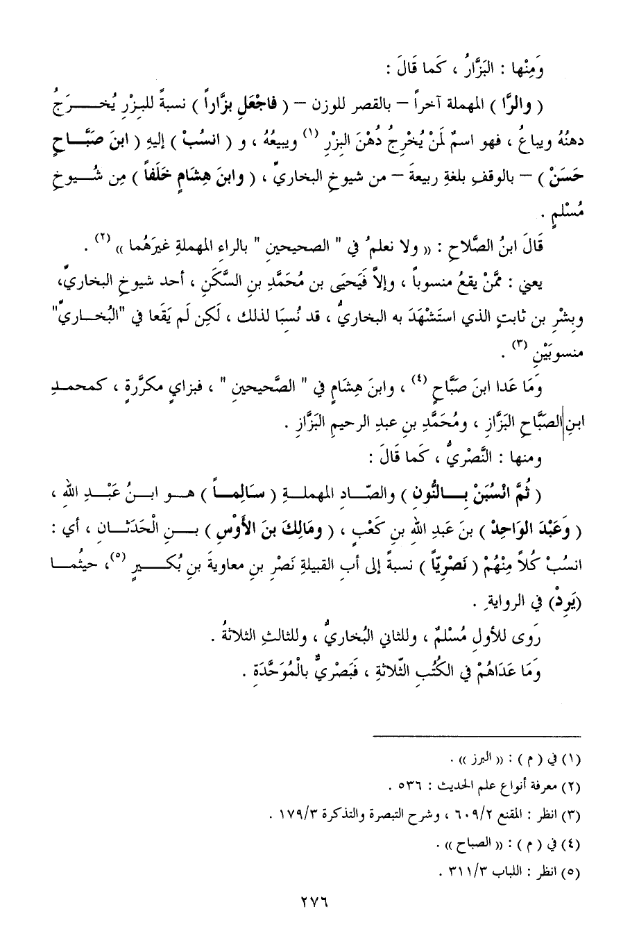 (والرَّا) المهملة آخراً - بالقصر للوزن - (فاجْعَلِ بزَّاراً) نسبةً للبِزْرِ يُخرَجُ دهنُهُ ويباعُ، فهو اسمٌ لمَنْ يُخْرِجُ دُهْنَ البِزْرِ (¬1) ويبيعُهُ، و (انسُبْ) إليهِ (ابنَ صَبَّاحٍ حَسَنْ) - بالوقفِ بلغةِ ربيعةَ - من شيوخِ البخاريِّ، (وابنَ هِشَامٍ خَلَفاً) مِن شُيوخِ مُسْلمٍ.