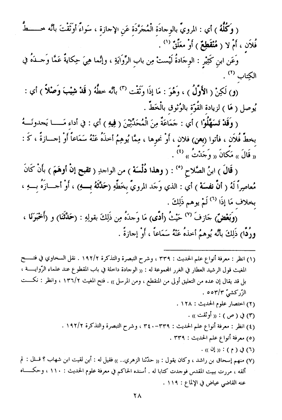 (¬1) انظر: معرفة أنواع علم الحديث: 339، وشرح التبصرة والتذكرة 2/ 192. نقل السخاوي في فتح المغيث قول الرشيد العطار في الغرر المجموعة له: ((الوجادة داخلة في باب المقطوع عند علماء الرّواية، بل قد يقال إن عده من التعليق أولى من المنقطع، ومن المرسل)). فتح المغيث 2/ 136، وانظر: نكت الزّركشيّ 3/ 553.
