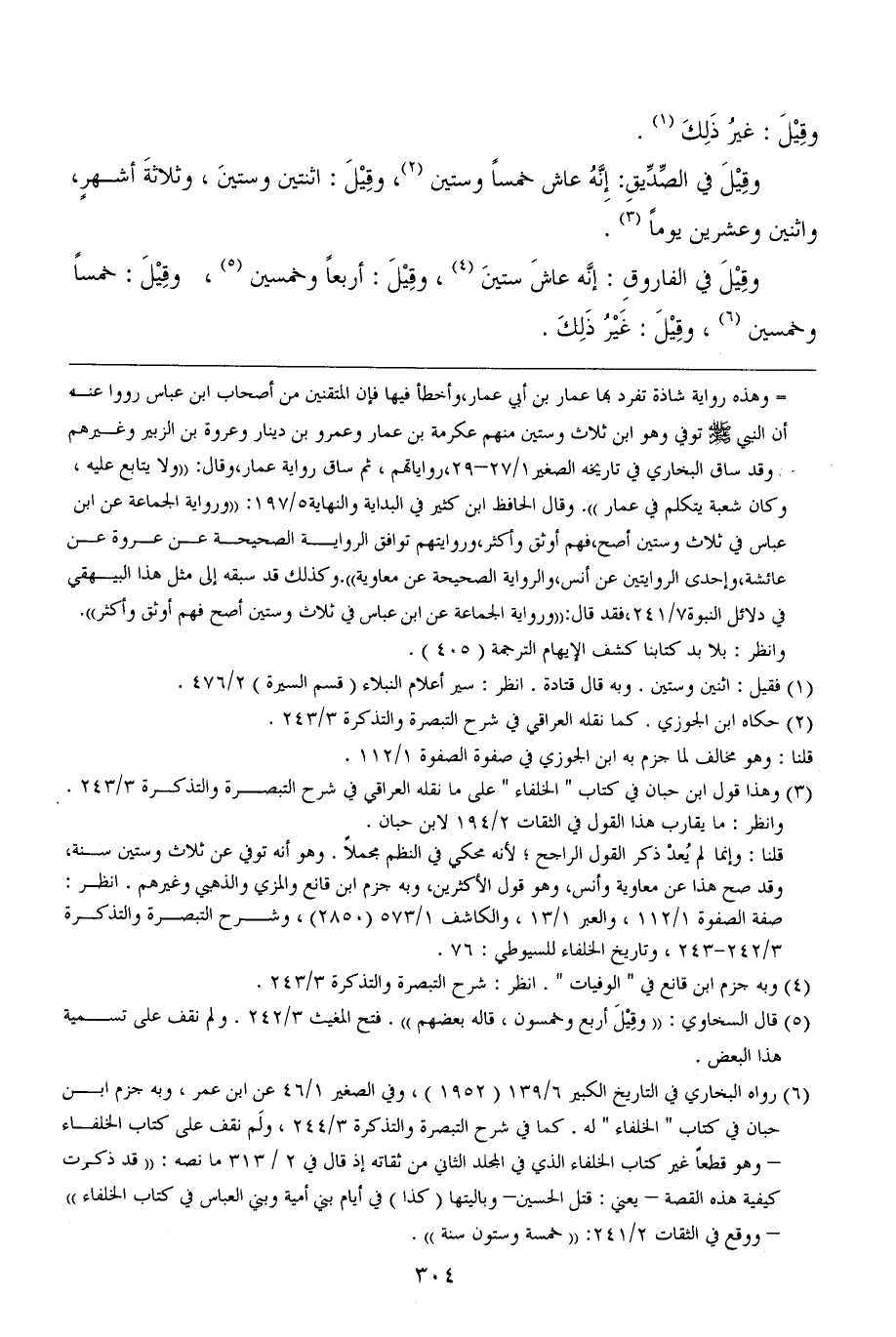 (¬6) رواه البخاري في التاريخ الكبير 6/ 139 (1952)، وفي الصغير 1/ 46 عن ابن عمر، وبه جزم ابن حبان في كتاب " الخلفاء " له. كما في شرح التبصرة والتذكرة 3/ 244، ولَم نقف على كتاب الخلفاء - وهو قطعاً غير كتاب الخلفاء الذي في المجلد الثاني من ثقاته إذ قال في 2/ 313 ما نصه: ((قد ذكرت كيفية هذه القصة - يعني: قتل الحسين- وباليتها (كذا) في أيام بني أمية وبني العباس في كتاب الخلفاء)) - ووقع في الثقات 2/ 241: ((خمسة وستون سنة)).