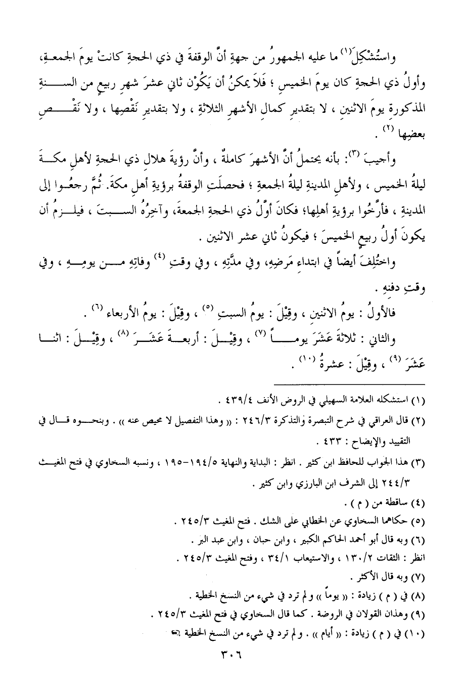 واستُشْكِلَ (¬1) ما عليه الجمهورُ من جهةِ أنَّ الوقفةَ في ذي الحجةِ كانتْ يومَ الجمعةِ، وأولُ ذي الحجةِ كان يومَ الخميسِ؛ فَلاَ يمكنُ أن يَكُوْن ثاني عشرَ شهرِ ربيعٍ من السنةِ المذكورةِ يومَ الاثنينِ، لا بتقديرِ كمالِ الأشهرِ الثلاثةِ، ولا بتقديرِ نَقْصِها، ولا نَقْصِ بعضِها (¬2).