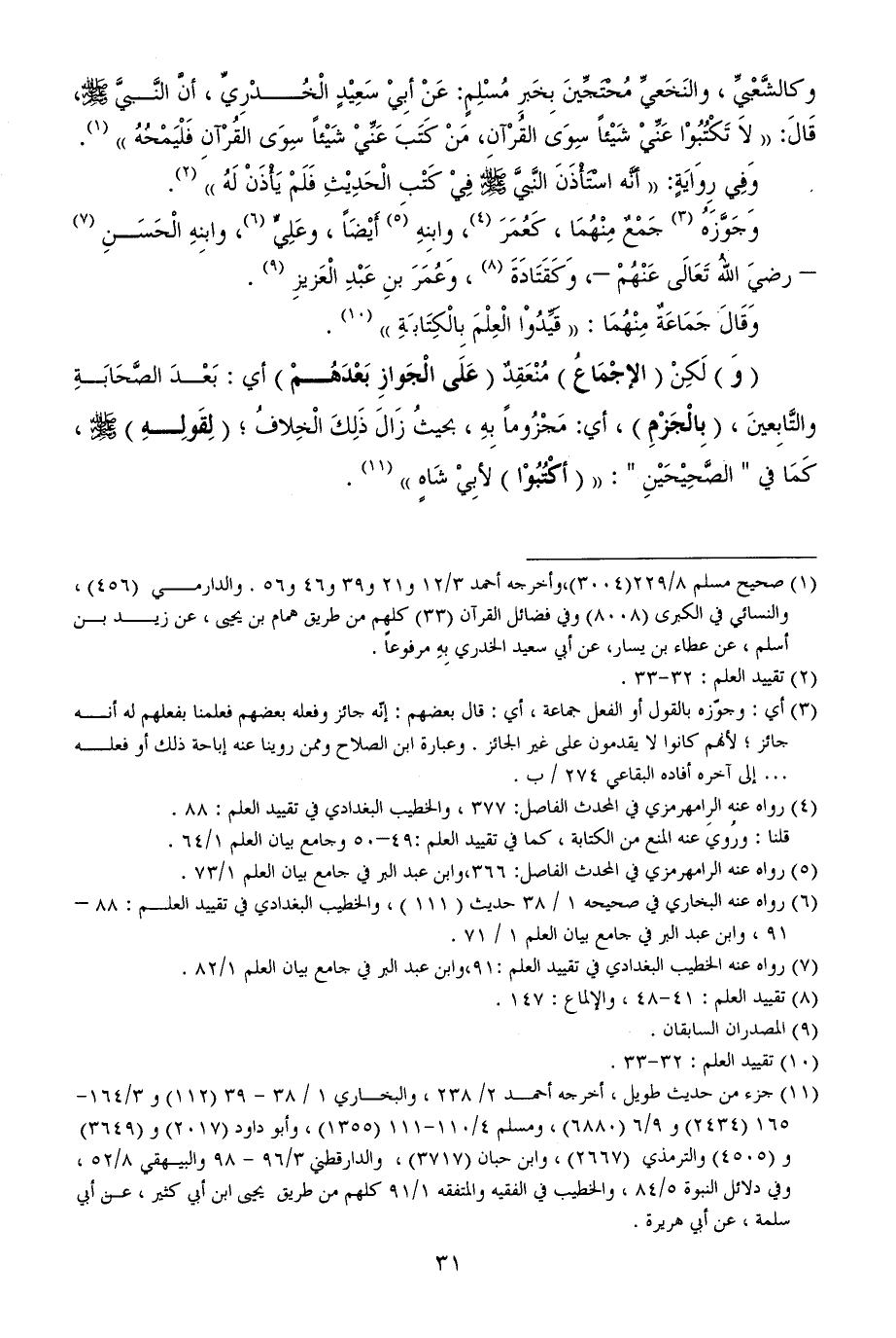 وَقَالَ جَمَاعَةٌ مِنْهُمَا: ((قَيِّدُوْا الْعِلْمَ بِالْكِتَابَةِ)) (¬10).