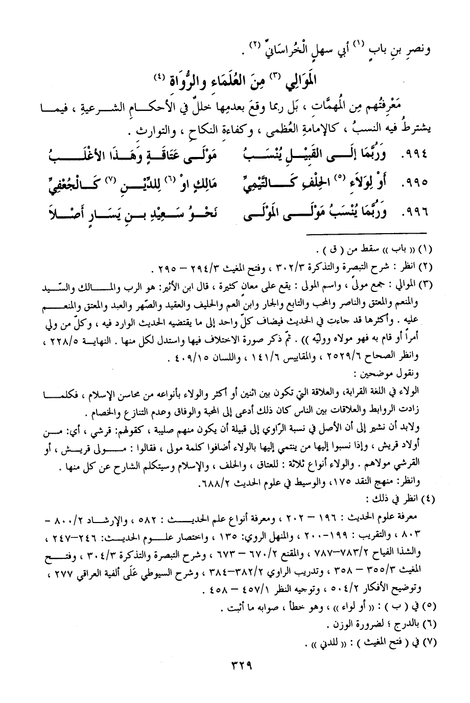 ولابد أن نشير إلى أن الأصل في نسبة الرّاوي إلى قبيلة أن يكون منهم صليبة، كقولهم: قرشي، أي: من أولاد قريش، وإذا نسبوا إليها من ينتمي إليها بالولاء أضافوا كلمة مولى، فقالوا: مولى قريش، أو القرشي مولاهم. والولاء أنواع ثلاثة: للعتاق، والحلف، والإسلام وسيتكلم الشارح عن كل منها.