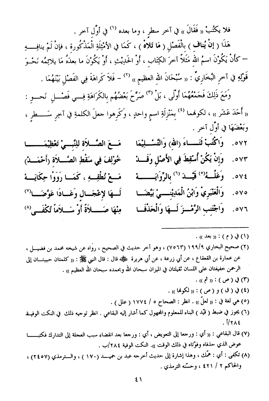 576 - وَاجْتَنِبِ الرَّمْزَ لَهَا وَالْحَذْفَا ... مِنْهَا صَلاَةً أَوْ سَلاَماً تُكْفَى (¬8)