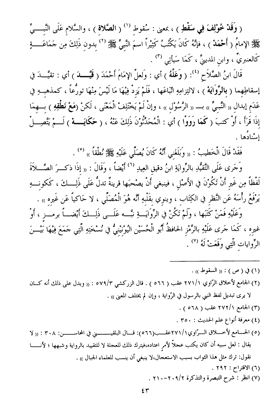 قَالَ ابنُ الصَّلاَحِ (¬4): (وَعَلَّهُ) أي: وَلعلَّ الإمَامَ أَحْمَدَ (قَيَّدَ) أي: تقيَّدَ في إسقاطِهِما (بِالرِّوَايَهْ)، لالتِزامِهِ اتّبَاعَها، فَلَمْ يَزِدْ فِيْهَا مَا لَيْسَ مِنْهَا تورُّعاً، كمذهبِهِ في عَدَمِ إبدالِ ((النَّبِيِّ)) بـ ((الرَّسُوْلِ))، وإنْ لَمْ يَخْتَلِفْ الْمَعْنَى، لَكنْ (مَعْ نَطْقِهِ) بِهِمَا إِذَا قَرَأَ، أَوْ كتبَ (كَمَا رَوَوْا) أي: الْمُحَدِّثُوْنَ ذَلِكَ عَنْهُ، (حَكَايَهْ) لَمْ يَتَّصِلْ إسْنادُها.