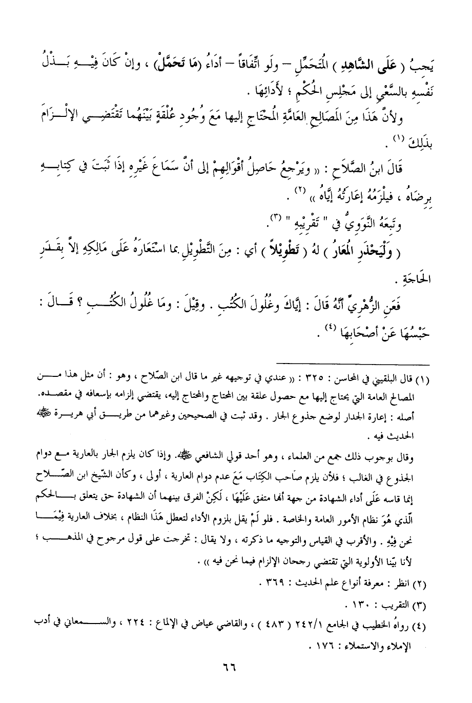 (¬1) قال البلقيني في المحاسن: 325: ((عندي في توجيهه غير ما قال ابن الصّلاح، وهو: أن مثل هذا من المصالح العامة التي يحتاج إليها مع حصول علقة بين المحتاج والمحتاج إليه، يقتضي إلزامه بإسعافه في مقصده. أصله: إعارة الجدار لوضع جذوع الجار. وقد ثبت في الصحيحين وغيرهما من طريق أبي هريرة - رضي الله عنه - الحديث فيه.