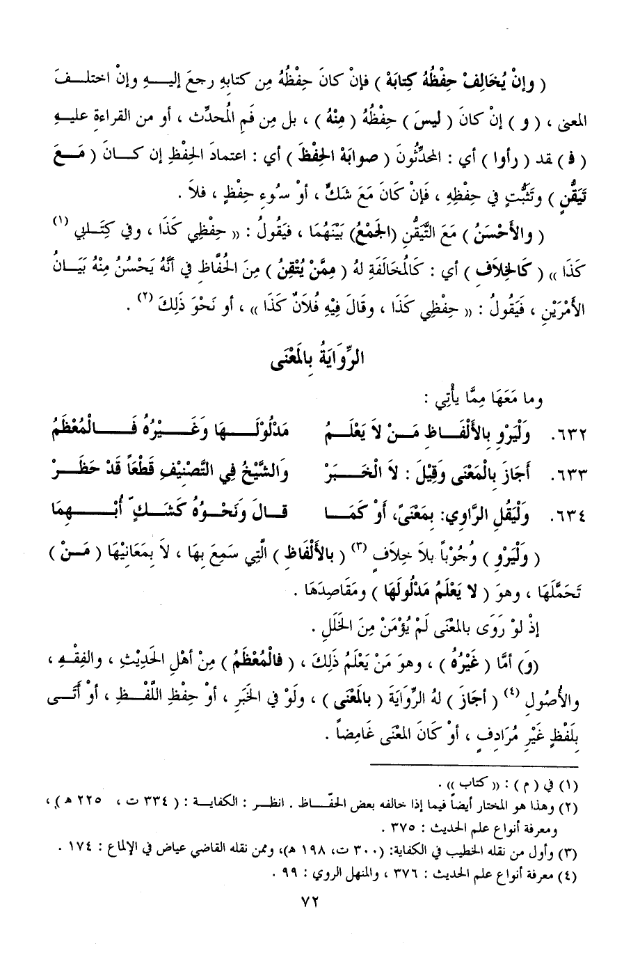 (وإنْ يُخَالِفْ حِفْظُهُ كِتابَهْ) فإنْ كانَ حِفْظُهُ مِن كتابِهِ رجعَ إليهِ وإنْ اختلفَ المعنى، (و) إنْ كانَ (ليسَ) حِفْظُهُ (مِنْهُ)، بل مِن فَمِ المُحدِّث، أو من القراءةِ عليهِ (ف) قد (رأوا) أي: المحدِّثُونَ (صوابَهْ الحِفْظَ) أي: اعتمادَ الحِفْظِ إن كانَ (مَعَ تَيَقُّنٍ) وتَثَبُّتٍ في حِفْظِهِ، فَإنْ كَانَ مَعَ شَكٍّ، أوْ سُوءِ حِفْظٍ، فلاَ.