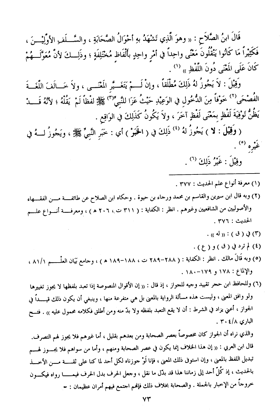 (¬6) وللحافظ ابن حجر تقييد وجيه للجواز، إذ قال: ((إن الأقوال المنصوصة إذا تعبد بلفظها لا يجوز تغييرها ولو وافق المعنى، وليست هذه مسألة الرواية بالمعنى بل هي متفرعة منها، وينبغي أن يكون ذلك قيداً في الجواز، أعني يزاد في الشرط: أن لا يقع التعبد بلفظه ولا بدّ منه ومن أطلق فكلامه محمول عليه)). فتح الباري 8/ 304.
