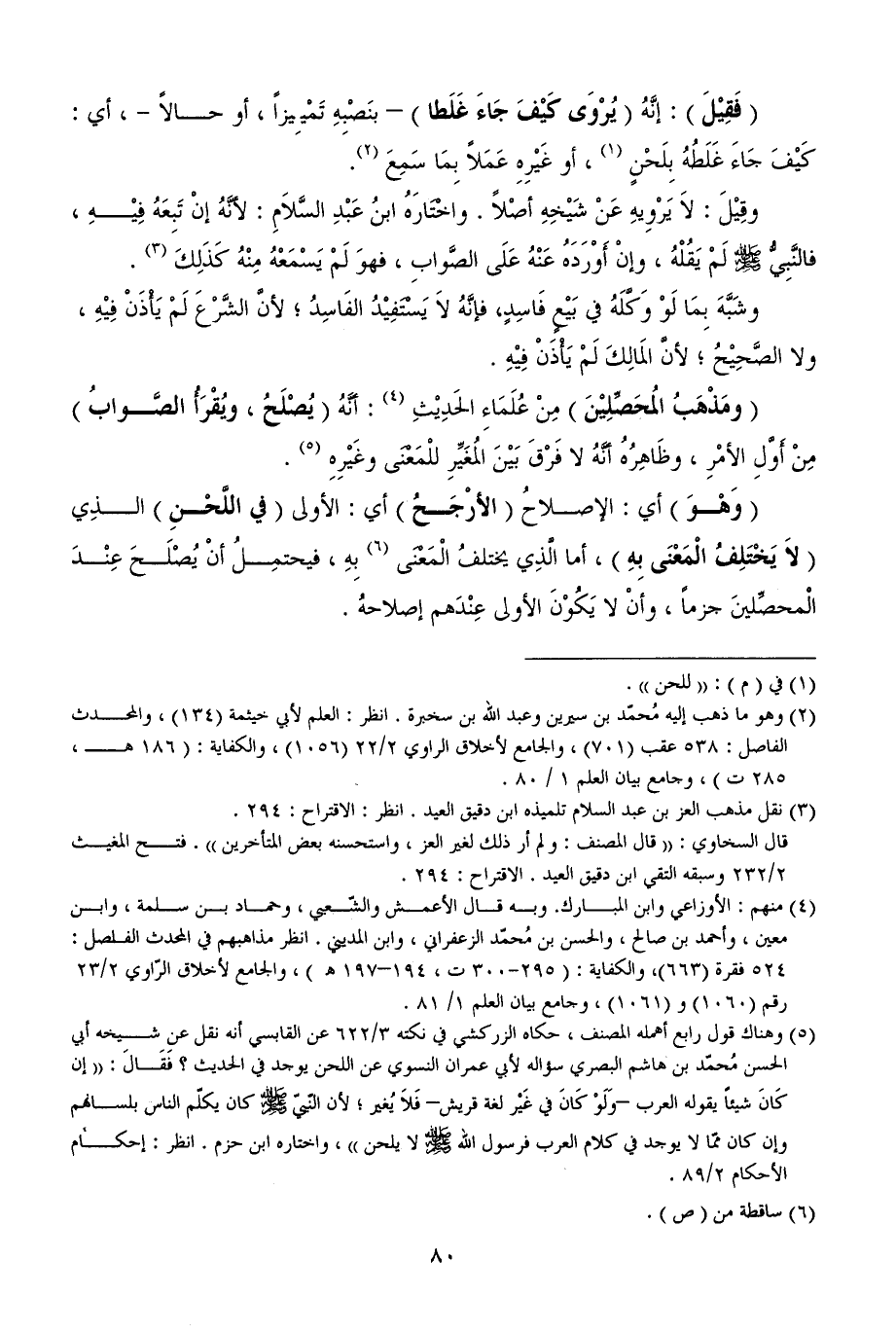 (¬5) وهناك قول رابع أهمله المصنف، حكاه الزركشي في نكته 3/ 622 عن القابسي أنه نقل عن شيخه أبي الحسن مُحمّد بن هاشم البصري سؤاله لأبي عمران النسوي عن اللحن يوجد في الحديث؟ فَقَالَ: ((إن كَانَ شيئاً يقوله العرب -وَلَوْ كَانَ في غَيْر لغة قريش- فَلاَ يُغير؛ لأن النّبيّ - صلى الله عليه وسلم - كان يكلّم الناس بلسانهم وإن كان ممّا لا يوجد في كلام العرب فرسول الله - صلى الله عليه وسلم - لا يلحن))، واختاره ابن حزم. انظر: إحكام الأحكام 2/ 89.