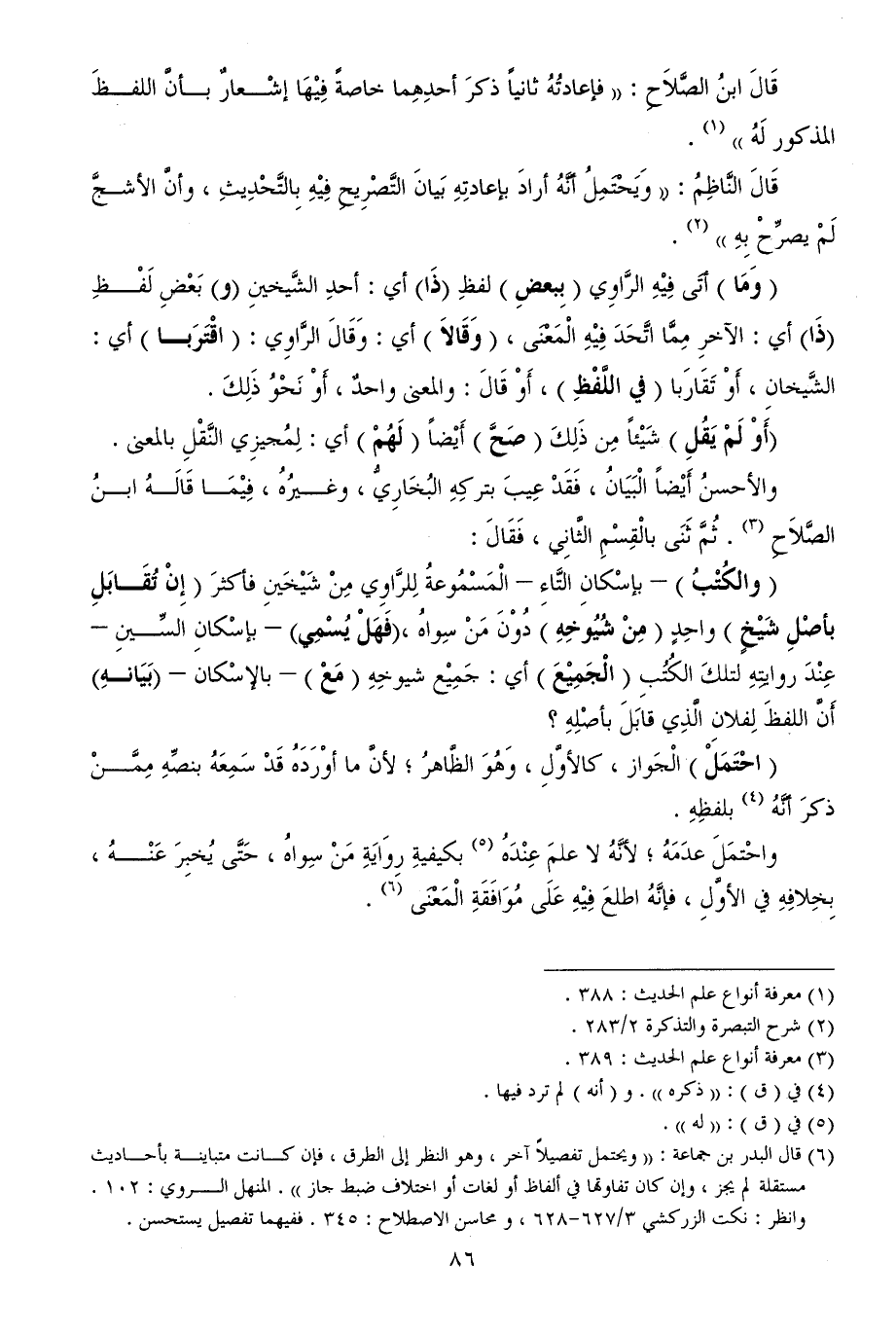 (¬6) قال البدر بن جماعة: ((ويحتمل تفصيلاً آخر، وهو النظر إلى الطرق، فإن كانت متباينة بأحاديث مستقلة لم يجز، وإن كان تفاوتها في ألفاظ أو لغات أو اختلاف ضبط جاز)). المنهل الروي: 102. وانظر: نكت الزركشي 3/ 627 - 628، ومحاسن الاصطلاح: 345. ففيهما تفصيل يستحسن.