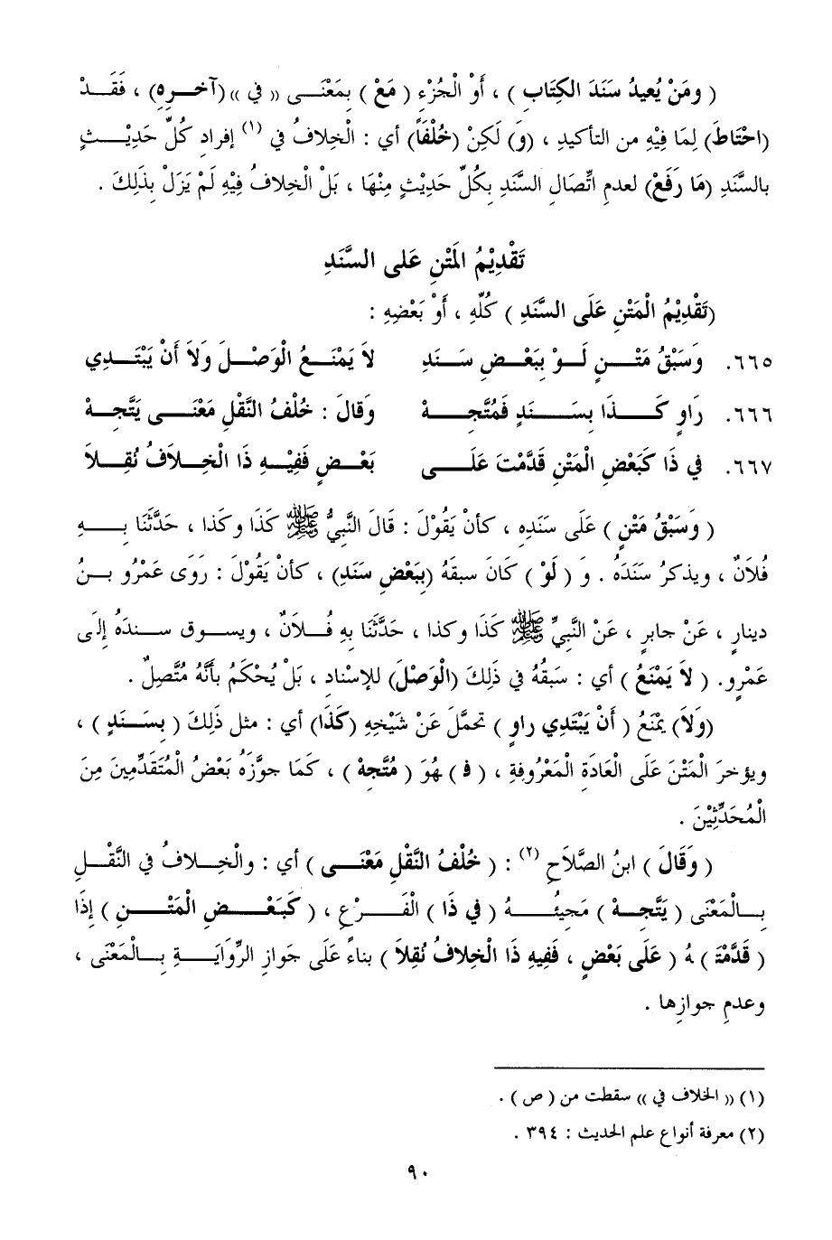 (وَقَالَ) ابنُ الصَّلاَحِ (¬2): (خُلْفُ النَّقْلِ مَعْنَى) أي: والْخِلافُ في النَّقْلِ بِالْمَعْنَى (يَتَّجِهْ) مَجِيئُهُ (في ذَا) الْفَرْعِ، (كَبَعْضِ الْمَتْنِ) إِذَا (قَدَّمْتَ) هُ (عَلَى بَعْضٍ، فَفِيهِ ذَا الْخِلافُ نُقِلاَ) بناءً عَلَى جَوازِ الرِّوَايَةِ بِالْمَعْنَى، وعدمِ جوازِها.
