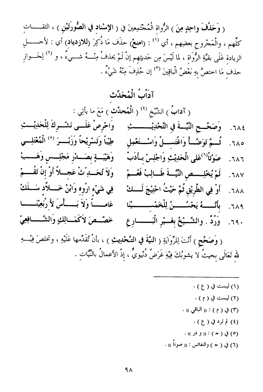 (وَصَحِّحِ) أَنْتَ لِلرِّوَايَةِ (النيَّةَ في التَّحْدِيثِ)، بأنْ تُقَدِّمها عَلَيْهِ، وتخلصَ فِيْهِ للهِ تَعَالَى بِحيثُ لا يشوبُكَ فِيْهِ غَرَضٌ دُنْيويٌّ، إِذْ الأعمالُ بالنِّيَّاتِ.