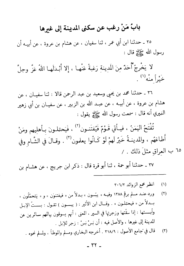 35 - حَدَّثَنَا ابْنُ أَبِي عُمَرَ، ثنا سُفْيَانُ، عَنْ هِشَامِ بْنِ عُرْوَةَ، عَنْ أَبِيهِ، أَنَّ رَسُولَ اللَّهِ صَلَّى اللهُ عَلَيْهِ وَسَلَّمَ قَالَ: «§لَا يَخْرُجُ أَحَدٌ مِنَ الْمَدِينَةِ رَغْبَةً عَنْهَا إِلَّا أَبْدَلَهَا اللَّهُ عَزَّ وَجَلَّ خَيْرًا مِنْهُ»