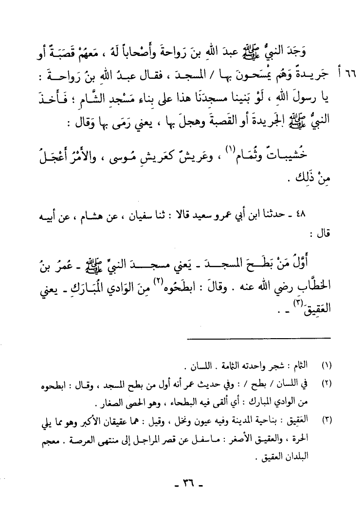 48 - حَدَّثَنَا ابْنُ أَبِي عُمَرَ، وَسَعِيدٌ قَالَا: ثنا سُفْيَانُ، عَنْ هِشَامٍ، عَنْ أَبِيهِ قَالَ: §أَوَّلُ مَنْ بَطَحَ الْمَسْجِدَ، يَعْنِي مَسْجِدَ النَّبِيِّ صَلَّى اللهُ عَلَيْهِ وَسَلَّمَ، عُمَرُ بْنُ الْخَطَّابِ رَضِيَ اللَّهُ عَنْهُ، وَقَالَ: " أَبْطِحُوهُ مِنَ الْوَادِي الْمُبَارَكِ، يَعْنِي الْعَقِيقَ