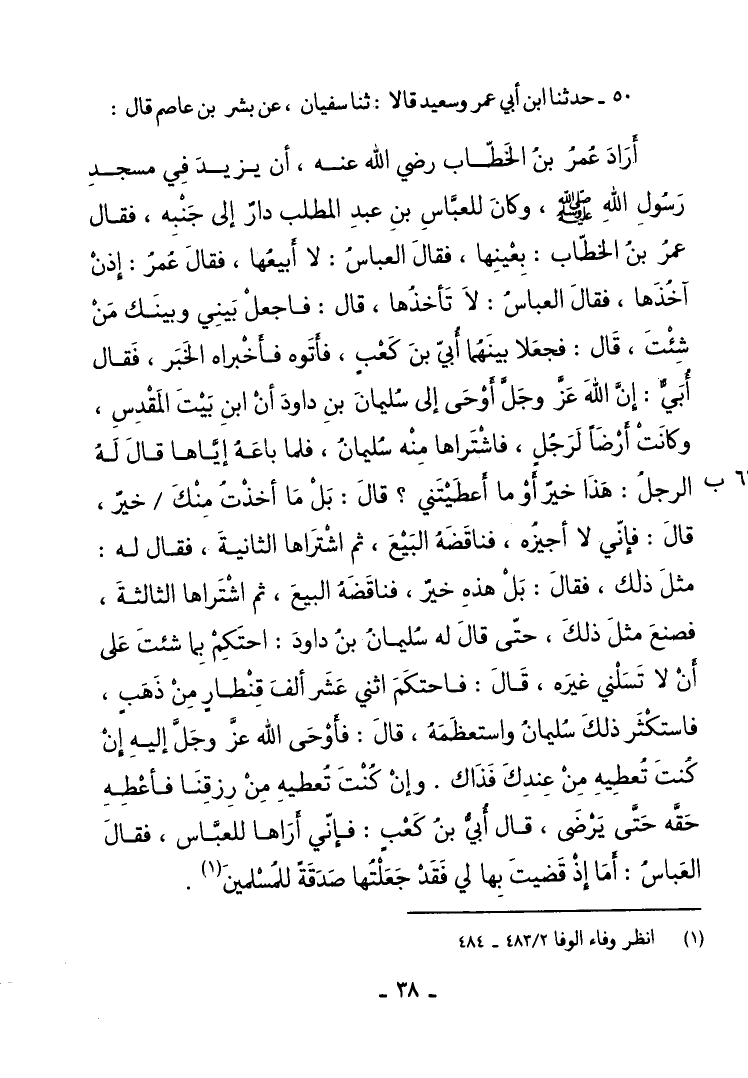 50 - حَدَّثَنَا ابْنُ أَبِي عُمَرَ، وَسَعِيدٌ قَالَا: ثنا سُفْيَانُ، عَنْ بِشْرِ بْنِ عَاصِمٍ قَالَ: §أَرَادَ عُمَرُ بْنُ الْخَطَّابِ رَضِيَ اللَّهُ عَنْهُ أَنْ يَزِيدَ فِي مَسْجِدِ رَسُولِ اللَّهِ صَلَّى اللهُ عَلَيْهِ وَسَلَّمَ، وَكَانَ لِلْعَبَّاسِ بْنِ عَبْدِ الْمُطَّلِبِ دَارٌ فِي جَنْبِهِ، فَقَالَ عُمَرُ بْنُ الْخَطَّابِ: بِعْنِيهَا، فَقَالَ الْعَبَّاسُ: لَا أَبِيعُهَا، فَقَالَ عُمَرُ: إِذَنْ آخُذُهَا، فَقَالَ الْعَبَّاسُ: لَا تَأْخُذُهَا قَالَ: فَاجْعَلْ بَيْنِي وَبَيْنَكَ مَنْ شِئْتَ، سُلَيْمَانَ بْنِ دَاوُدَ أَنِ ابْنِ بَيْتَ الْمَقْدِسِ، وَكَانَتْ أَرْضًا لِرَجُلٍ، فَاشْتَرَاهَا مِنْهُ سُلَيْمَانُ، فَلَمَّا بَاعَهُ إِيَّاهَا قَالَ لَهُ الرَّجُلُ: هَذَا خَيْرٌ وَمَا أَعْطَيْتَنِي قَالَ: بَلْ مَا أَخَذْتُ مِنْكَ خَيْرٌ قَالَ: فَإِنِّي لَا أُجِيزُهُ، فَنَاقَضَهُ الْبَيْعَ، ثُمَّ اشْتَرَاهَا الثَّانِيَةَ فَقَالَ لَهُ مِثْلَ ذَلِكَ، فَقَالَ: بَلْ هَذِهِ خَيْرٌ، فَنَاقَضَهُ الْبَيْعَ، ثُمَّ اشْتَرَاهَا الثَّالِثَةَ فَصَنَعَ مِثْلَ ذَلِكَ حَتَّى قَالَ لَهُ سُلَيْمَانُ بْنُ دَاوُدَ: احْتَكِمْ بِمَا شِئْتَ عَلَيَّ أَنْ لَا تَسْأَلَنِي غَيْرَهُ قَالَ: فَاحْتَكَمَ اثْنَيْ عَشَرَ أَلْفَ قِنْطَارٍ مِنْ ذَهَبٍ، فَاسْتَكْثَرَ ذَلِكَ سُلَيْمَانُ وَاسْتَعْظَمَهُ قَالَ: فَأَوْحَى اللَّهُ عَزَّ وَجَلَّ إِلَيْهِ إِنْ كُنْتَ تُعْطِيهِ مِنْ عِنْدِكَ فَذَاكَ، وَإِنْ كُنْتَ تُعْطِيهِ مِنْ رِزْقِنَا فَأَعْطِهِ حَقَّهُ حَتَّى يَرْضَى قَالَ أُبَيُّ بْنُ كَعْبٍ: فَإِنِّي أَرَاهَا لِلْعَبَّاسِ، فَقَالَ الْعَبَّاسُ: «أَمَّا إِذَا قَضَيْتَ بِهَا لِي فَقَدْ جَعَلْتُهَا صَدَقَةً لِلْمُسْلِمِينَ»
