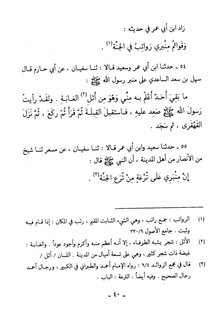 55 - حَدَّثَنَا سَعِيدٌ، وَابْنُ أَبِي عُمَرَ قَالَا: ثنا سُفْيَانُ، عَنْ مِسْعَرٍ، ثنا شَيْخٌ، مِنَ الْأَنْصَارِ مِنْ أَهْلِ الْمَدِينَةِ، أَنَّ النَّبِيَّ صَلَّى اللهُ عَلَيْهِ وَسَلَّمَ قَالَ: «إِنَّ §مِنْبَرِي عَلَى تُرْعَةٍ مِنْ تُرَعِ الْجَنَّةِ»