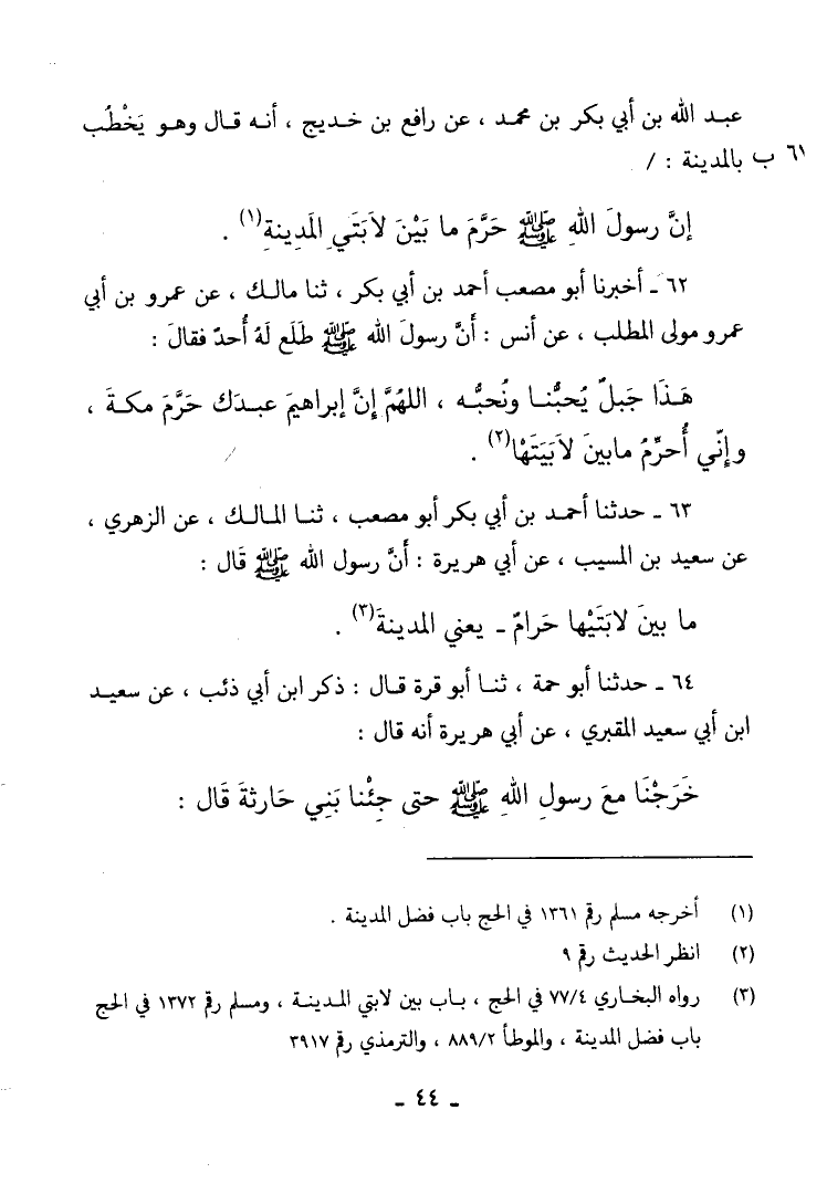 62 - أَخْبَرَنَا أَبُو مُصْعَبٍ أَحْمَدُ بْنُ أَبِي بَكْرٍ، ثنا مَالِكٌ، عَنْ عَمْرِو بْنِ أَبِي عَمْرٍو، مَوْلَى الْمُطَّلِبِ، عَنْ أَنَسٍ، أَنَّ رَسُولَ اللَّهِ صَلَّى اللهُ عَلَيْهِ وَسَلَّمَ طَلَعَ لَهُ أُحُدٌ فَقَالَ: «§هَذَا جَبَلٌ يُحِبُّنَا وَنُحِبُّهُ، اللَّهُمَّ إِنَّ إِبْرَاهِيمَ عَبْدَكَ حَرَّمَ مَكَّةَ، وَإِنِّي أُحَرِّمُ مَا بَيْنَ لَابَتَيْهَا»