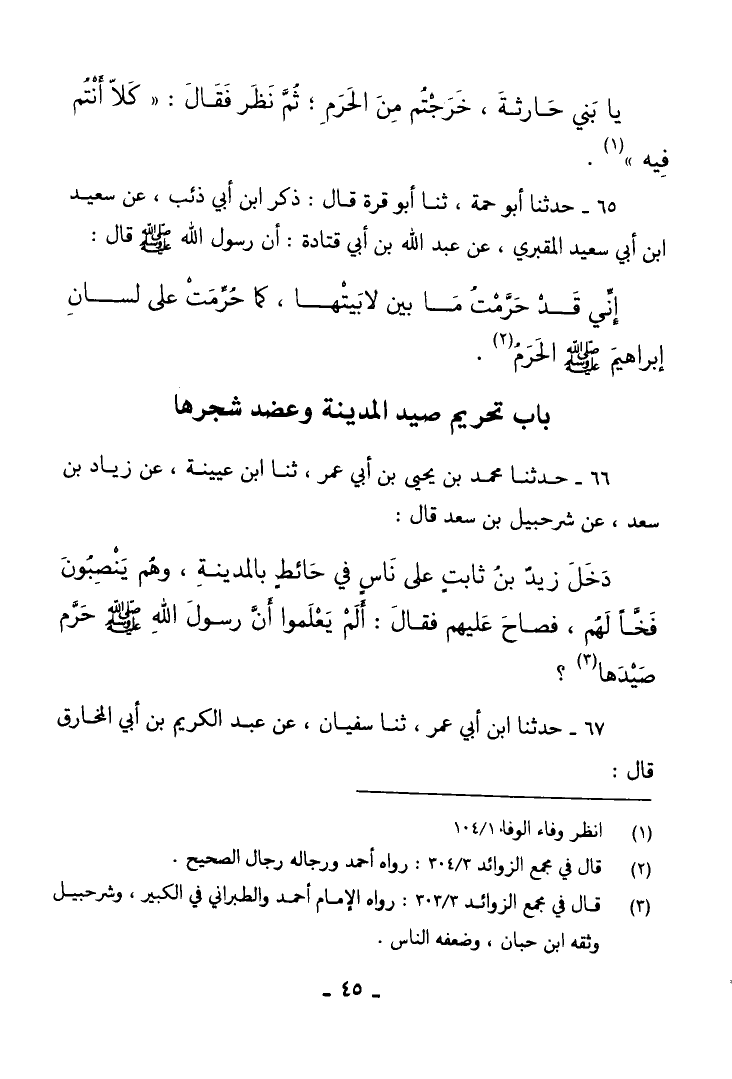 66 - حَدَّثَنَا مُحَمَّدُ بْنُ يَحْيَى بْنِ أَبِي عُمَرَ، ثنا ابْنُ عُيَيْنَةَ، عَنْ زِيَادِ بْنِ سَعْدٍ، عَنْ شُرَحْبِيلَ بْنِ سَعْدٍ قَالَ: دَخَلَ زَيْدُ بْنُ ثَابِتٍ عَلَى نَاسٍ فِي حَائِطٍ بِالْمَدِينَةِ وَهُمْ يَنْصَبُونَ فَخًّا لَهُمْ، فَصَاحَ عَلَيْهِمْ فَقَالَ: «§أَلَمْ يَعْلَمُوا أَنَّ رَسُولَ اللَّهِ صَلَّى اللهُ عَلَيْهِ وَسَلَّمَ حَرَّمَ صَيْدَهَا؟»