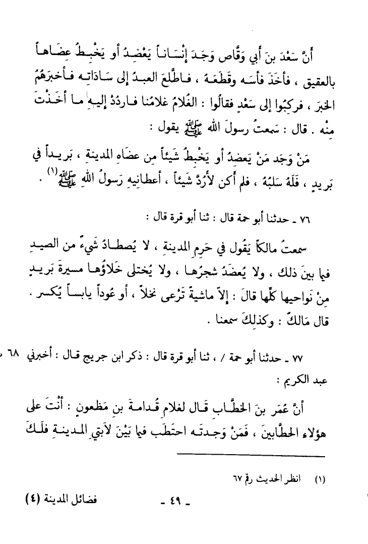 76 - حَدَّثَنَا أَبُو حُمَةَ قَالَ: ثنا أَبُو قُرَّةَ قَالَ: سَمِعْتُ مَالِكًا يَقُولُ فِي حَرَمِ الْمَدِينَةِ: " §لَا يُصْطَادُ شَيْءٌ مِنَ الصَّيْدِ فِيمَا بَيْنَ ذَلِكَ، وَلَا يُعْضَدُ شَجَرُهَا، وَلَا يُخْتَلَى خَلَاؤُهَا مَسِيرَةَ بَرِيدٍ مِنْ نَوَاحِيهَا كُلِّهَا قَالَ: إِلَّا مَاشِيَةً تَرْعَى نَخْلًا أَوْ عُودًا يَابِسًا يُكْسَرُ قَالَ مَالِكٌ: وَكَذَلِكَ سَمِعْنَا "