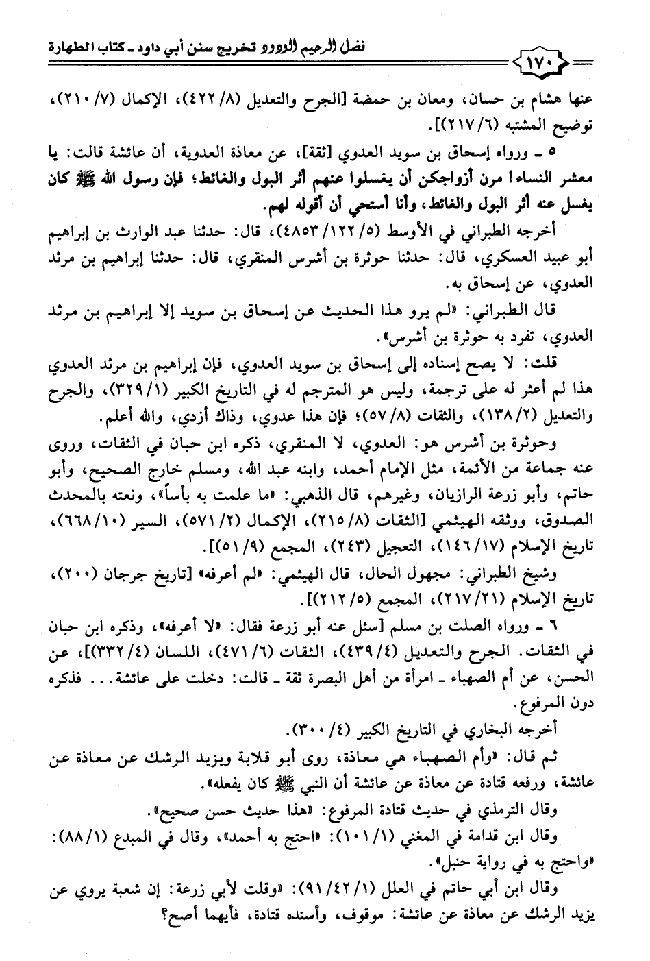 ٥ - ورواه إسحاق بن سويد العدوي [ثقة]، عن معاذة العدوية، أن عائشة قالت: يا معشر النساء! مرن أزواجكن أن يغسلوا عنهم أثر البول والغائط؛ فإن رسول الله - صلى الله عليه وسلم - كان يغسل عنه أثر البول والغائط، وأنا أستحي أن أقوله لهم.