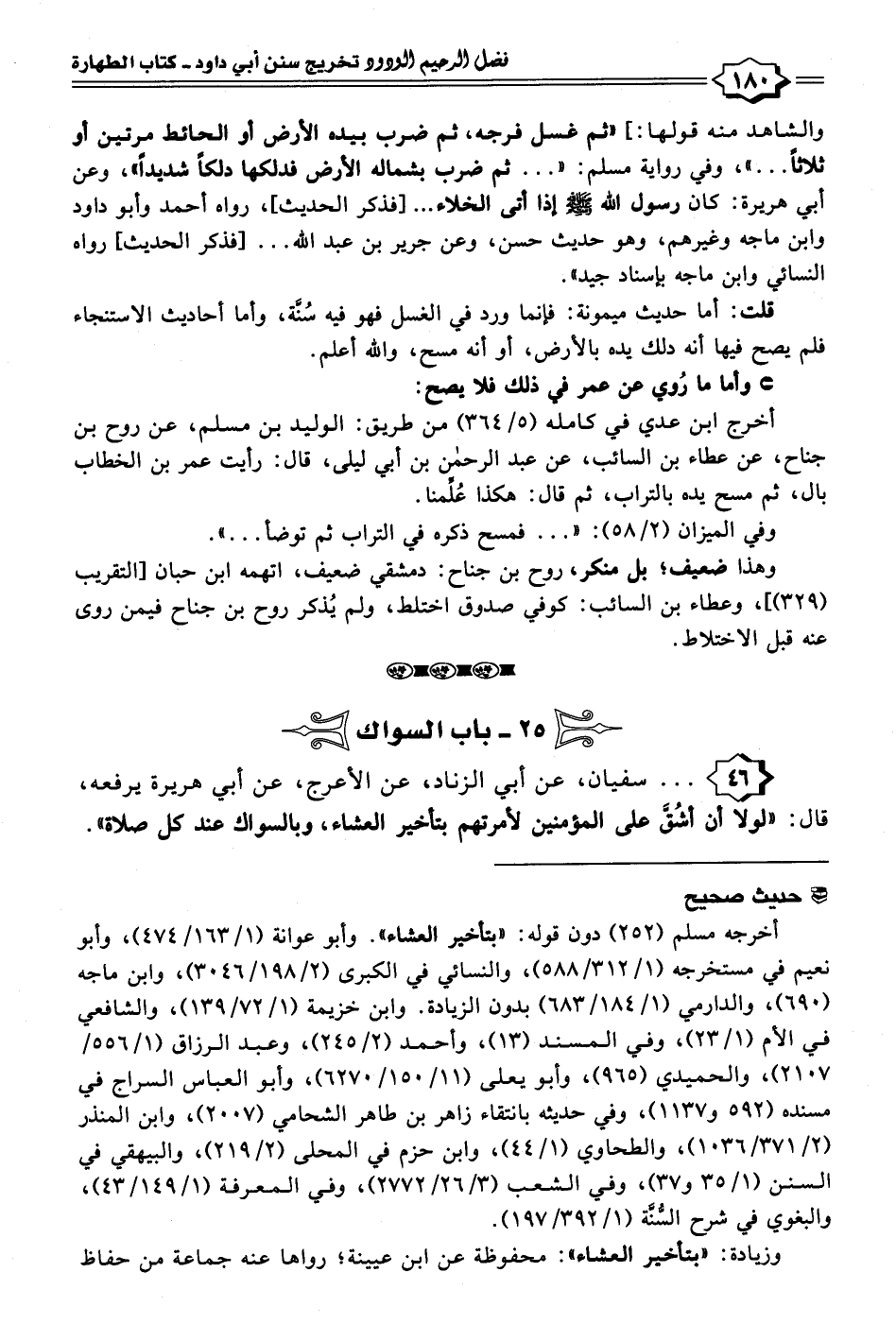 ٤٦ - . . . سفيان، عن أبي الزناد، عن الأعرج، عن أبي هريرة يرفعه، قال: "لولا أن أشق على المؤمنين لأمرتهم بتأخير العشاء، وبالسواك عند كل صلاة".
