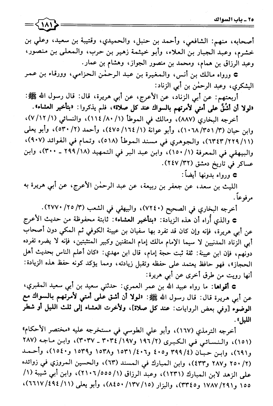 أربعتهم: عن أبي الزناد، عن الأعرج، عن أبي هريرة، قال: قال رسول الله - صلى الله عليه وسلم -: "لولا أن أشُقَّ على أمتي لأمرتهم بالسواك عند كل صلاة"، فلم يذكروا: "بتأخير العشاء".