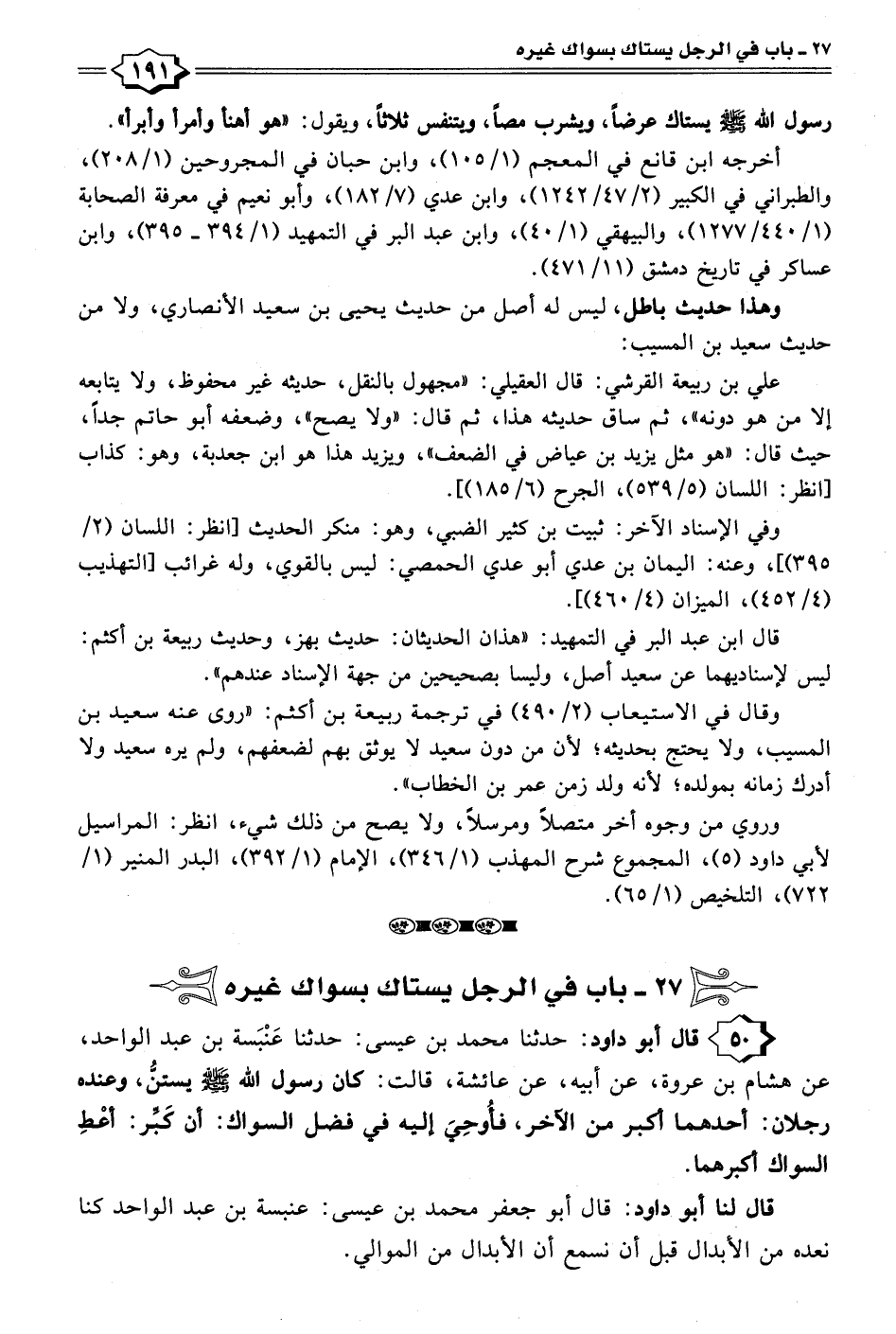 ٥٠ - قال أبو داود: حدثنا محمد بن عيسى: حدثنا عَنْبَسة بن عبد الواحد، عن هشام بن عروة، عن أبيه، عن عائشة، قالت: كان رسول الله - صلى الله عليه وسلم - يستنُّ، وعنده رجلان: أحدهما أكبر من الآخر، فأُوحِيَ إليه في فضل السواك: أن كَبِّر: أعْطِ السواك أكبرهما.