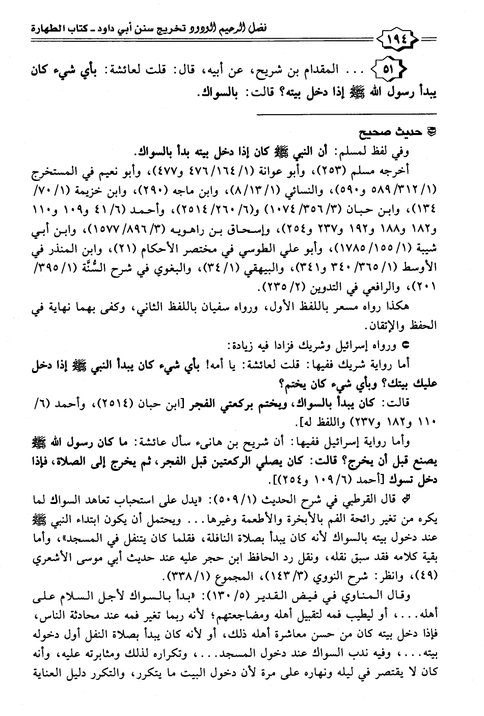 ٥١ - . . . المقدام بن شريح، عن أبيه، قال: قلت لعائشة: بأي شيء كان يبدأ رسول الله - صلى الله عليه وسلم - إذا دخل بيته؟ قالت: بالسواك.