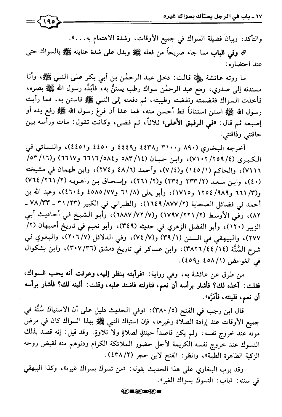 • وفي الباب مما جاء صريحًا من فعله - صلى الله عليه وسلم - ويدل على شدة عنايته - صلى الله عليه وسلم - بالسواك حتى عند احتضاره: