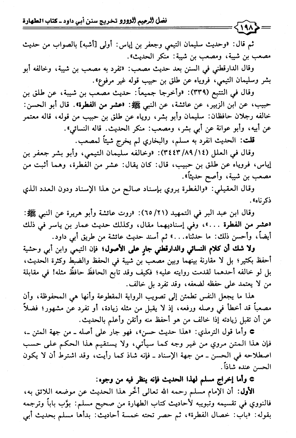 ولا شك أن كلام النسائي والدارقطني جارٍ على الأصول؛ فإن التيمي وابن أبي وحشية أحفظ بكثير؛ بل لا مقارنة بينهما وبين مصعب بن شيبة في الحفظ والضبط وكثرة الحديث، بل لو خالفه أحدهما لقدمت روايته عليه؛ فكيف وقد تابع الحافظَ حافظٌ مثله! في مقابلة من لا يعتمد على حفظه لضعفه، وقد تفرد بل خالف.