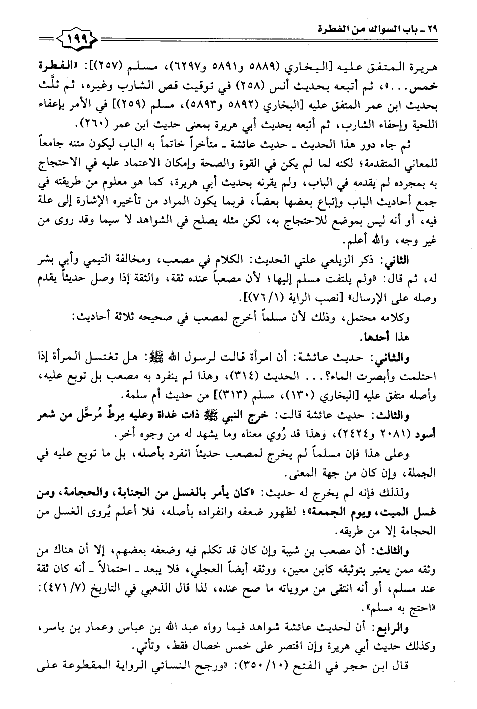 هريرة المتفق عليه [البخاري (٥٨٨٩ و ٥٨٩١ و ٦٢٩٧)، مسلم (٢٥٧)]: "الفطرة خمس. . ."، ثم أتبعه بحديث أنس (٢٥٨) في توقيت قص الشارب وغيره، ثم ثلَّث بحديث ابن عمر المتفق عليه [البخاري (٥٨٩٢ و ٥٨٩٣)، مسلم (٢٥٩)، في الأمر بإعفاء اللحية وإحفاء الشارب، ثم أتبعه بحديث أبي هريرة بمعنى حديث ابن عمر (٢٦٠).