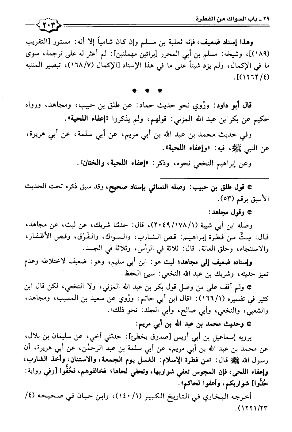 قال أبو داود: ورُوي نحو حديث حماد: عن طلق بن حبيب، ومجاهد، ورواه حكيم عن بكر بن عبد الله المزني: قولهم، ولم يذكروا "إعفاء اللحية".