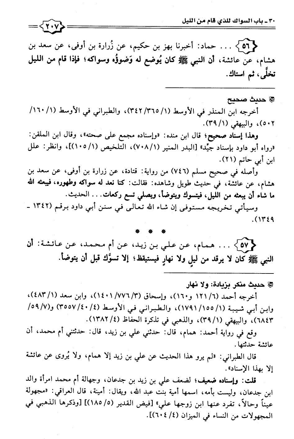 ٥٧ - . . . همام، عن علي بن زيد، عن أم محمد، عن عائشة: أن النبي - صلى الله عليه وسلم - كان لا يرقد من ليلٍ ولا نهارٍ فيستيقظ؛ إلا تسوَّك قبل أن يتوضأ.
