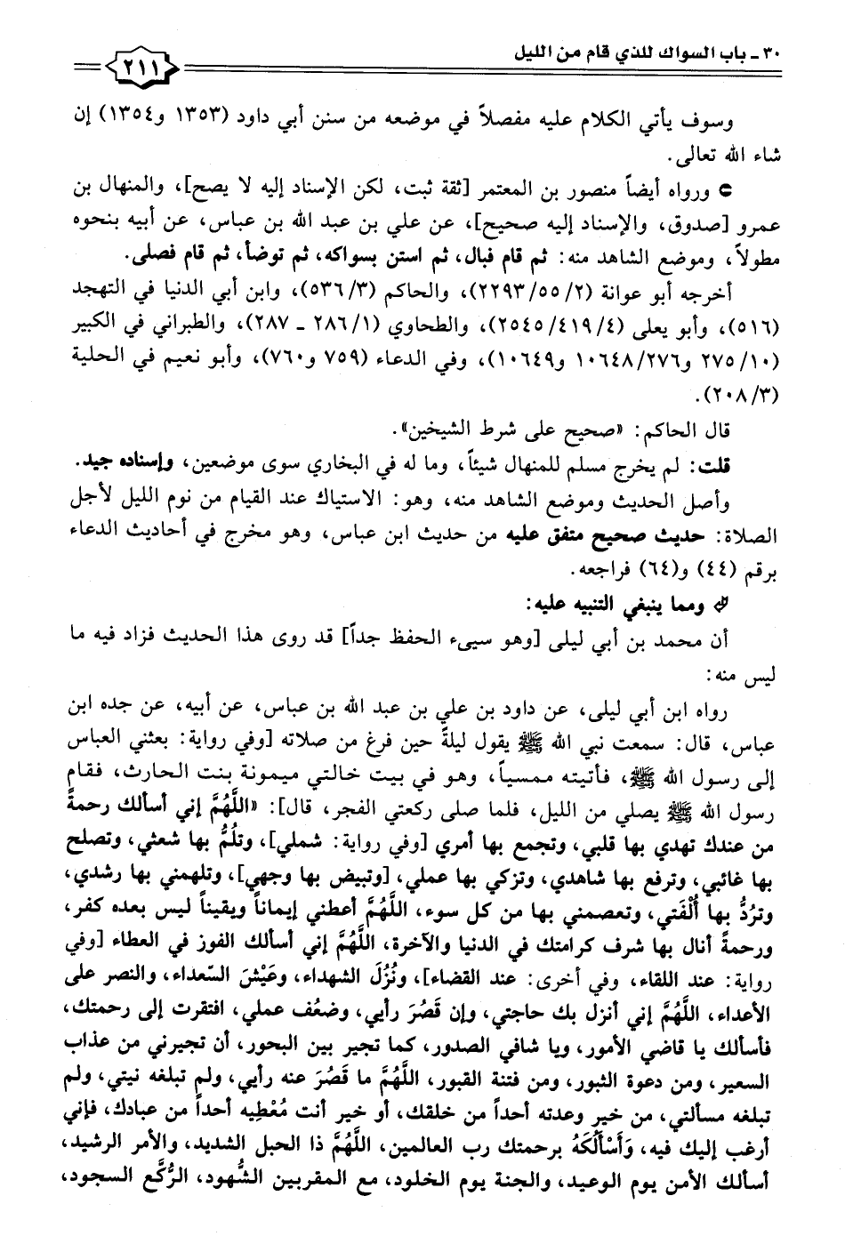 أن محمد بن أبي ليلى [وهو سيئ الحفظ جدًّا] قد روى هذا الحديث فزاد فيه ما ليس منه: رواه ابن أبي ليلى، عن داود بن علي بن عبد الله بن عباس، عن أبيه، عن جده ابن عباس، قال: سمعت نبي الله - صلى الله عليه وسلم - يقول ليلةً حين فرغ من صلاته أو في رواية: بعثني العباس إلى رسول الله - صلى الله عليه وسلم -، فأتيته ممسيًا، وهو في بيت خالتي ميمونة بنت الحارث، فقام رسول الله - صلى الله عليه وسلم - يصلي من الليل، فلما صلى ركعتي الفجر، قال]: "اللَّهُمَّ إني أسألك رحمة من عندك تهدي بها قلبي، وتجمع بها أمري [وفي رواية: شملي]، وتلُمُّ بها شعثي، وتصلح بها غائبي، وترفع بها شاهدي، وتزكي بها عملي، [وتبيض بها وجهي]، وتلهمني بها رشدي، وترُدُّ بها أُلفَتي، وتعصمني بها من كل سوء، اللَّهُمَّ أعطني إيمانًا ويقينًا ليس بعده كفر، ورحمةً أنال بها شرف كرامتك في الدنيا والآخرة، اللَّهُمَّ إني أسألك الفوز في العطاء [وفي رواية: عند اللقاء، وفي أخرى: عند القضاء]، ونُزُلَ الشهداء، وعَيْشَ السعداء، والنصر على الأعداء، اللَّهُمَّ إني أنزل بك حاجتي، وإن قَصُرَ رأيي، وضعُف عملي، افتقرت إلى رحمتك، فأسألك يا قاضي الأمور، ويا شافي الصدور، كما تجير بين البحور، أن تجيرني من عذاب السعير، ومن دعوة الثبور، ومن فتنة القبور، اللَّهُمَّ ما قَصُرَ عنه رأيي، ولم تبلغه نيتي، ولم تبلغه مسألتي، من خير وعدته أحدًا من خلقك، أو خير أنت مُعْطِيه أحدًا من عبادك، فإني أرغب إليك فيه، وَأَسْأَلُكَهُ برحمتك رب العالمين، اللَّهُمَّ ذا الحبل الشديد، والأمر الرشيد، أسألك الأمن يوم الوعيد، والجنّة يوم الخلود، مع المقربين الشُّهود، الرُّكَّع السجود،