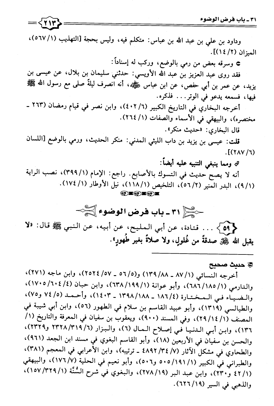 أخرجه النسائي (١/ ٨٧ - ٨٨/ ١٣٩) و (٥/ ٥٦ - ٥٧/ ٢٥٢٤)، وابن ماجة (٢٧١)، والدارمي (١/ ١٨٥/ ٦٨٦)، وأبو عوانة (١/ ١٩٩/ ٦٣٨)، وابن حبان (٤/ ٦٠٤/ ١٧٠٥)، والضياء في المختارة (٤/ ١٨٦ - ١٨٨/ ١٣٩٨ - ١٤٥٣)، وأحمد (٥/ ٧٤ و ٧٥)، والطيالسي (١٣١٩)، وأبو عبيد القاسم بن سلام في الطهور (٥٦)، وابن أبي شيبة في المصنف (١/ ١٤/ ٢٩)، وفي المسند (٩٠٠)، ويعقوب بن سفيان في المعرفة والتاريخ (١/ ١٣٦)، وابن أبي الدنيا في إصلاح المال (٦)، والبزار (٦/ ٣١٩/ ٢٣٢٨ و ٢٣٢٩)، والحسن بن سفيان في الأربعين (١٨)، وأبو القاسم البغوي في مسند ابن الجعد (٩٦١)، والطحاوي في مشكل الآثار (٧/ ٣٤/ ٤٨٩٢ - ترتيبه)، وابن الأعرابي في المعجم (٣٨١)، والطبراني في الكبير (١/ ١٩١/ ٥٠٥ و ٥٠٦)، وأبو نعيم في الحلية (٧/ ١٧٦)، والبيهقي (١/ ٤٢ / ٢٣٠)، وابن عبد البر (١٩/ ٢٧٨)، والبغوي في شرح السنة (١/ ٣٢٩/ ١٥٧)، والذهبي في السير (١٩/ ٦٢٦).