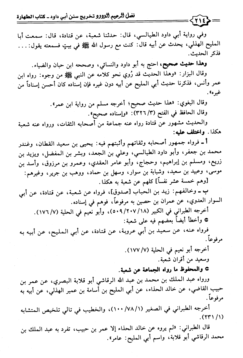 وفي رواية أبي داود الطيالسي، قال: حدثنا شعبة، عن قتادة، قال: سمعت أبا المليح الهذلي، يحدث عن أبيه قال: كنت مع رسول الله - صلى الله عليه وسلم - في بيتٍ فسمعته يقول: ... فذكر الحديث.
