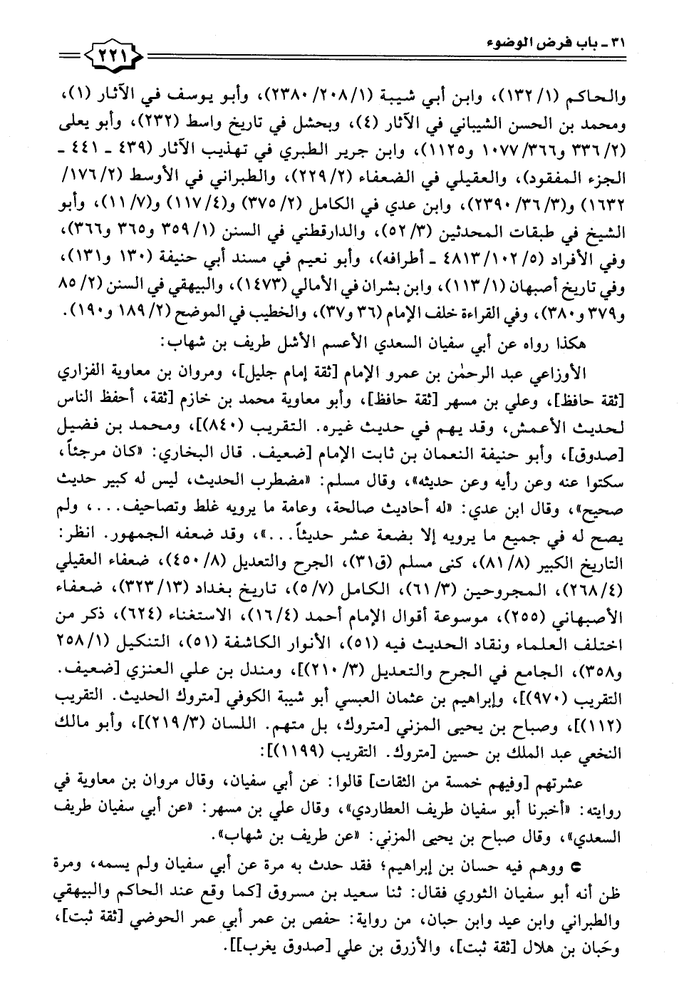 عشرتهم [وفيهم خمسة من الثقات] قالوا: عن أبي سفيان، وقال مروان بن معاوية في روايته: [أخبرنا أبو سفيان طريف العطاردي"، وقال علي بن مسهر: "عن أبي سفيان طريف السعدي"، وقال صباح بن يحيى المزني: "عن طريف بن شهاب".