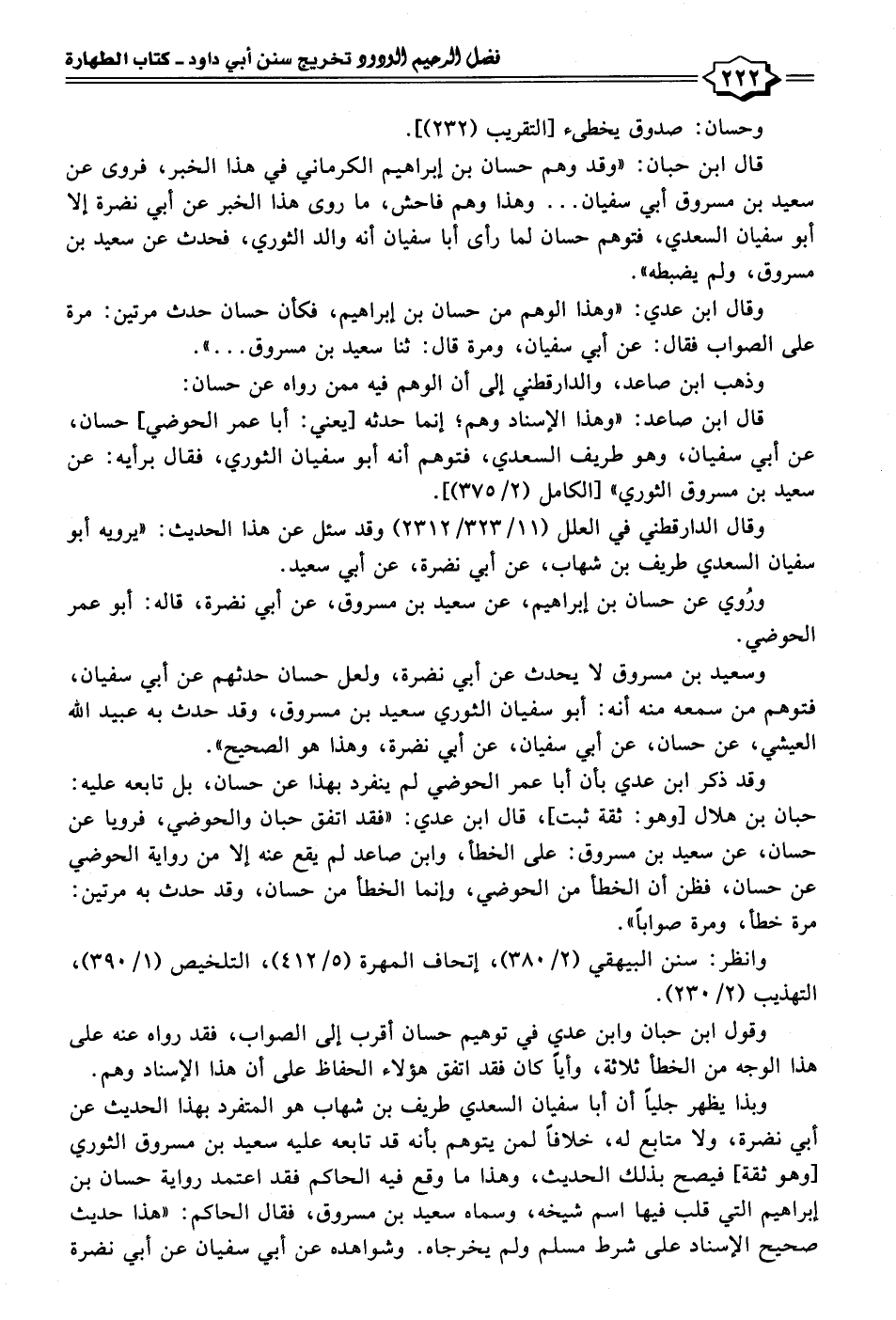 وسعيد بن مسروق لا يحدث عن أبي نضرة، ولعل حسان حدثهم عن أبي سفيان، فتوهم من سمعه منه أنَّه: أبو سفيان الثوري سعيد بن مسروق، وقد حدث به عبيد الله العيشي، عن حسان، عن أبي سفيان، عن أبي نضرة، وهذا هو الصحيح".