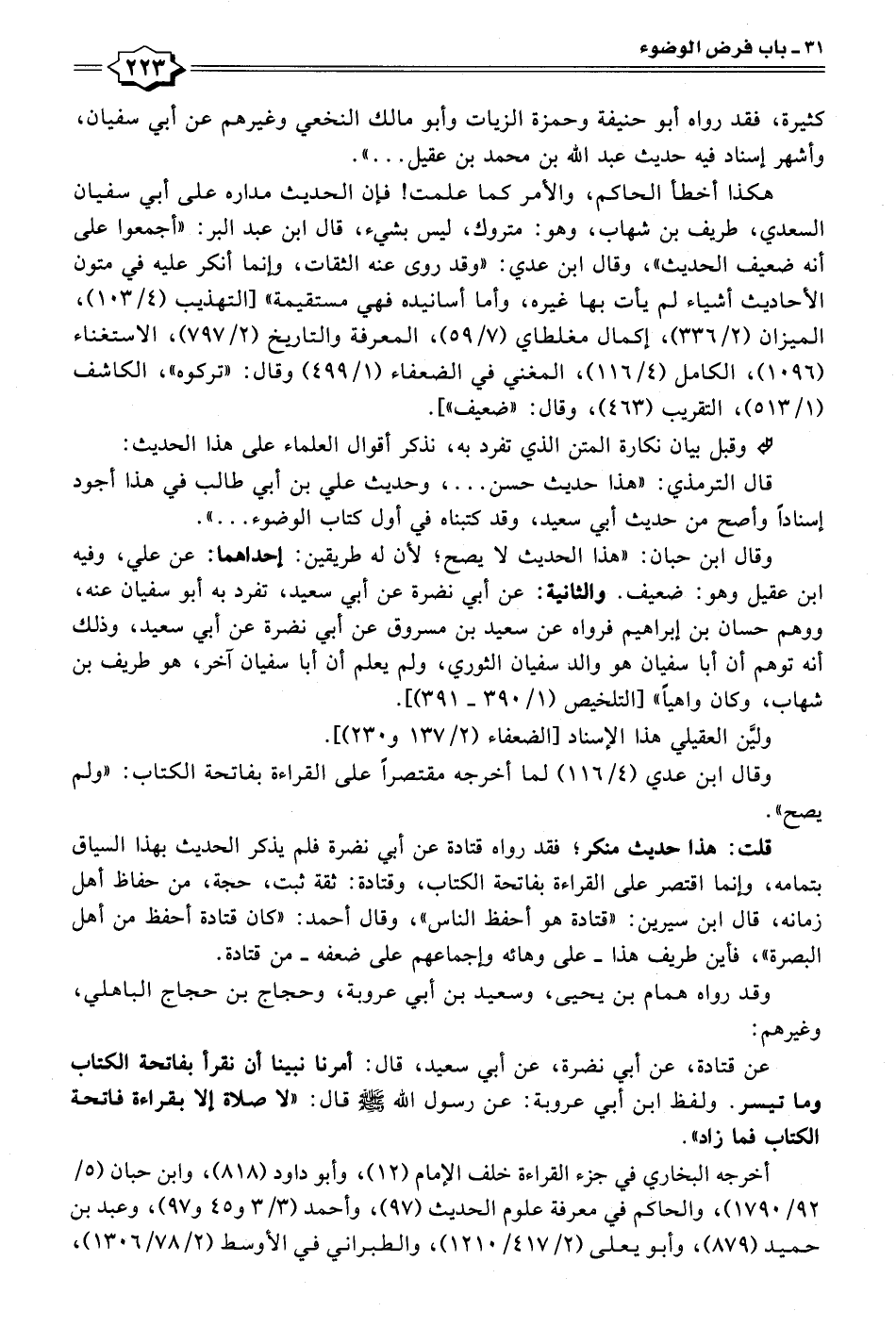 وقال ابن حبان: "هذا الحديث لا يصح؛ لأنَّ له طريقين: احداهما: عن علي، وفيه ابن عقيل وهو: ضعيف. والثانية: عن أبي نضرة عن أبي سعيد، تفرد به أبو سفيان عنه، ووهم حسان بن إبراهيم فرواه عن سعيد بن مسروق عن أبي نضرة عن أبي سعيد، وذلك أنَّه توهم أن أبا سفيان هو والد سفيان الثوري، ولم يعلم أن أبا سفيان آخر، هو طريف بن شهاب، وبيان واهيًا" [التلخيص (١/ ٣٩٠ - ٣٩١)].