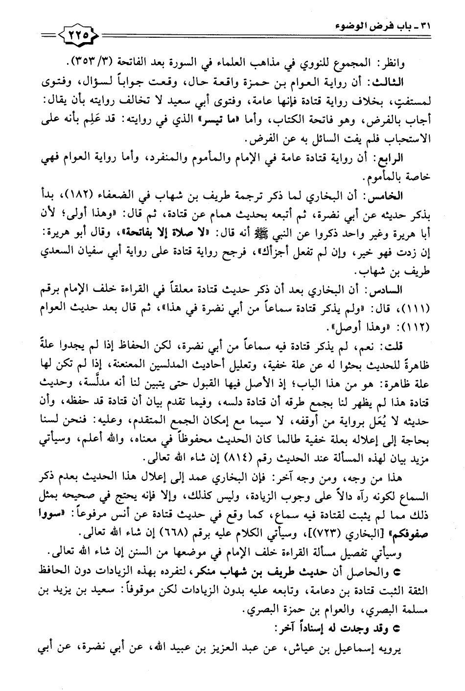 السادس: أن البخاري بعد أن ذكر حديث قتادة معلقًا في القراءة خلف الإمام برقم (١١١)، قال: "ولم يذكر قتادة سماعًا من أبي نضرة في هذا"، ثم قال بعد حديث العوام (١١٢): "هذا أوصل".