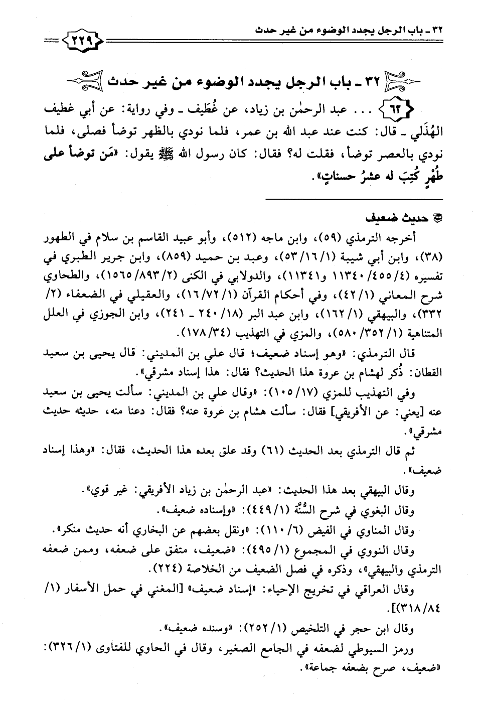 ٦٢ - . . . عبد الرحمن بن زياد، عن غُطَيف - وفي رواية: عن أبي غطيف الهُذَلي - قال: كنت عند عبد الله بن عمر، فلما نودي بالظهر توضأ فصلى، فلما نودي بالعصر توضأ، فقلت له؛ فقال: كان رسول الله - صلى الله عليه وسلم - يقول: "مَن توضأ على طُهْرٍ كُتِبَ له عشرُ حسناتٍ".