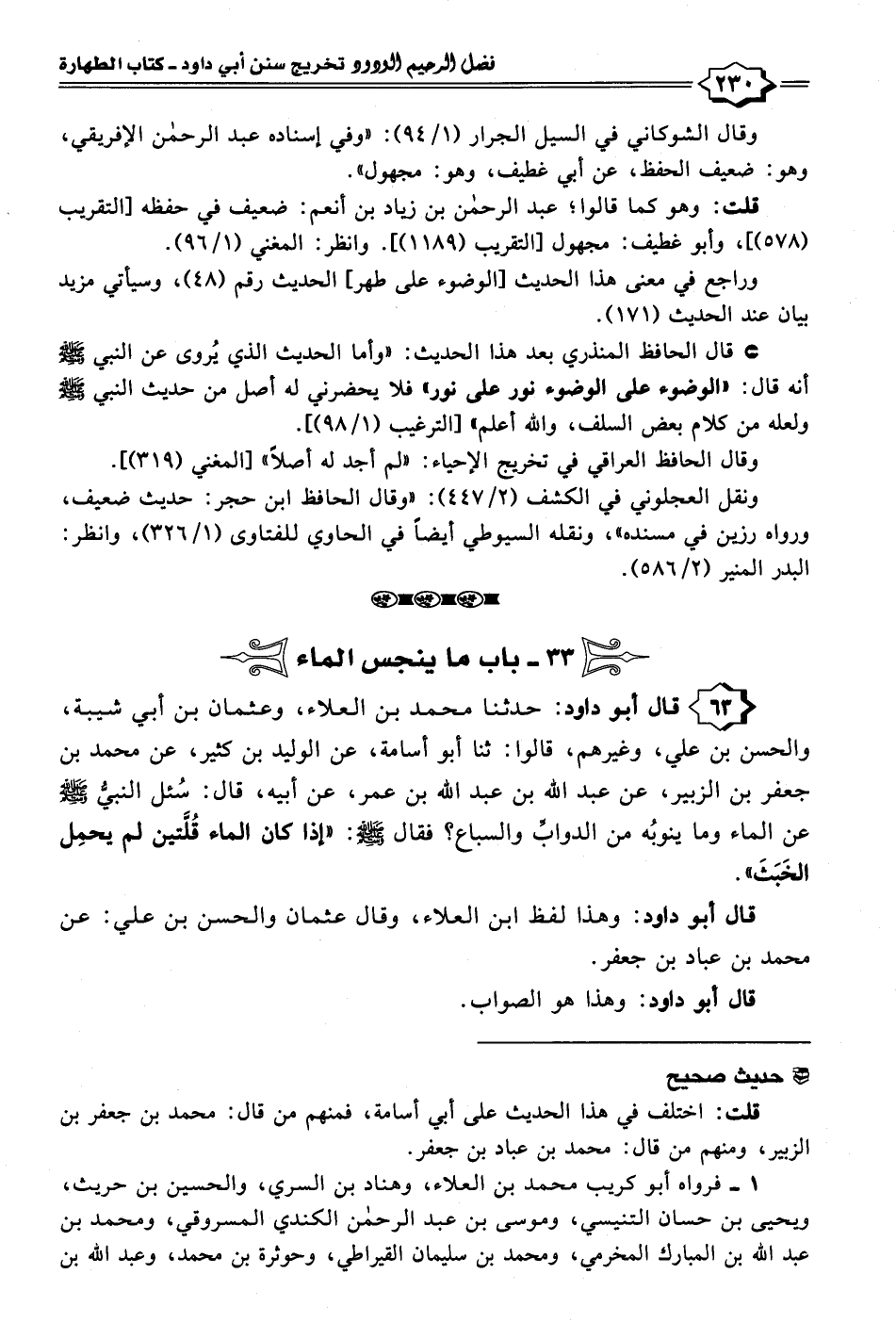 ٦٣ - قال أبو داود: حدثنا محمد بن العلاء، وعثمان بن أبي شيبة، والحسن بن علي، وغيرهم، قالوا: ثنا أبو أسامة، عن الوليد بن كثير، عن محمد بن جعفر بن الزبير، عن عبد الله بن عبد الله بن عمر، عن أبيه، قال: سُئل النبيُّ - صلى الله عليه وسلم - عن الماء وما ينوبُه من الدوابِّ والسباع؟ فقال - صلى الله عليه وسلم -: "إذا كان الماء قُلَّتين لم يحمِل الخَبَثَ".
